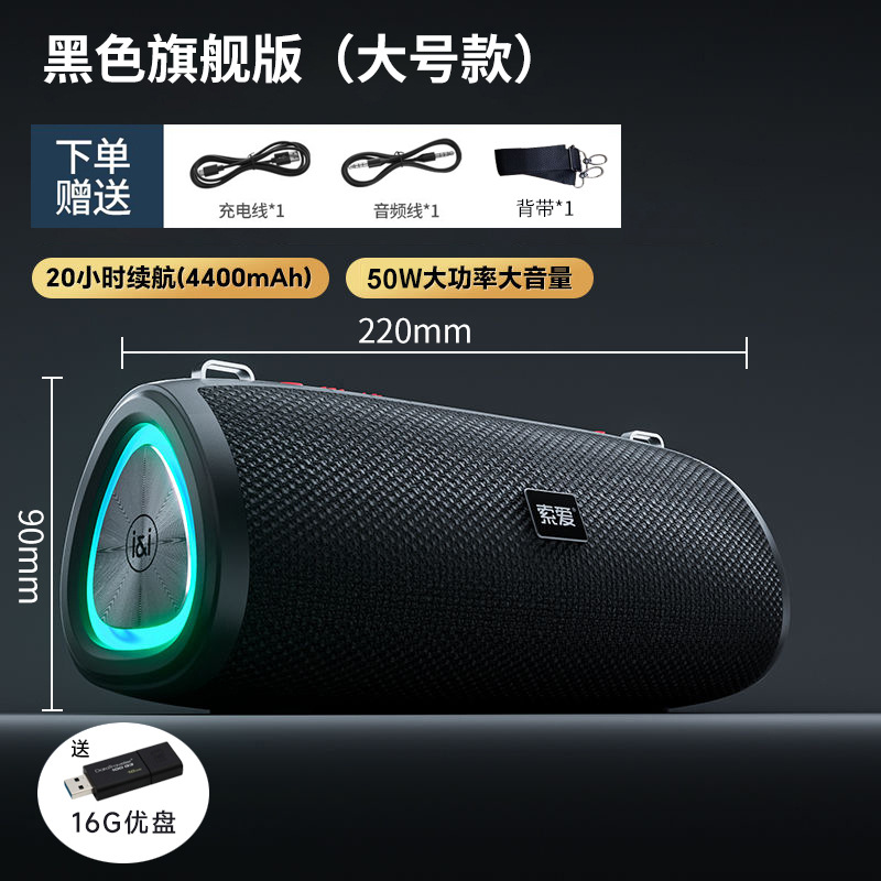 • 대형 플래그십 블랙 + 16G USB 플래시 드라이브 - 무료 스트랩 [Typce 충전 + Bluetooth 5.3 + FM 라디오]