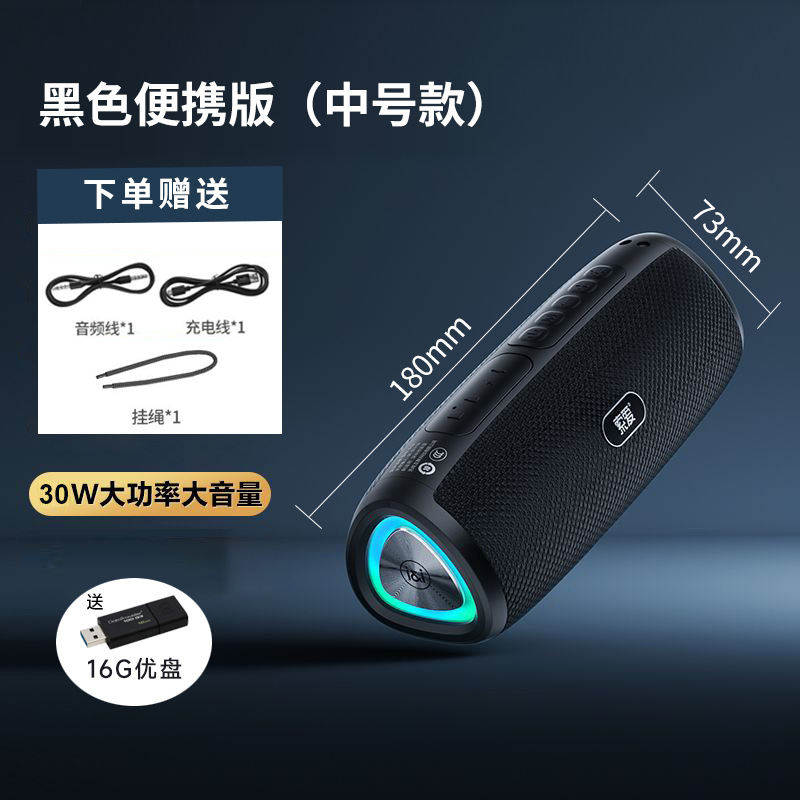 • 중형 휴대용 검정색 + 16G USB 플래시 드라이브 - 끈 포함 [Typce 충전 + Bluetooth 5.3 + FM 라디오]
