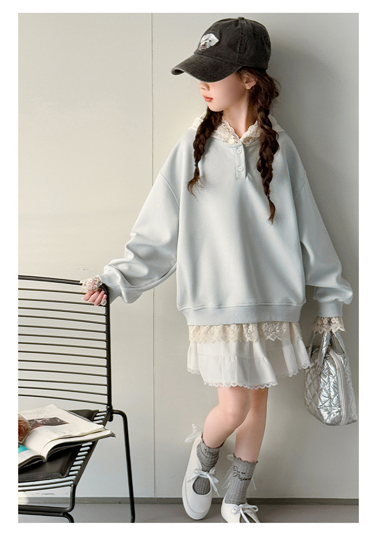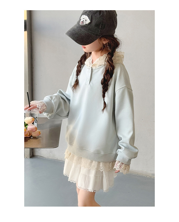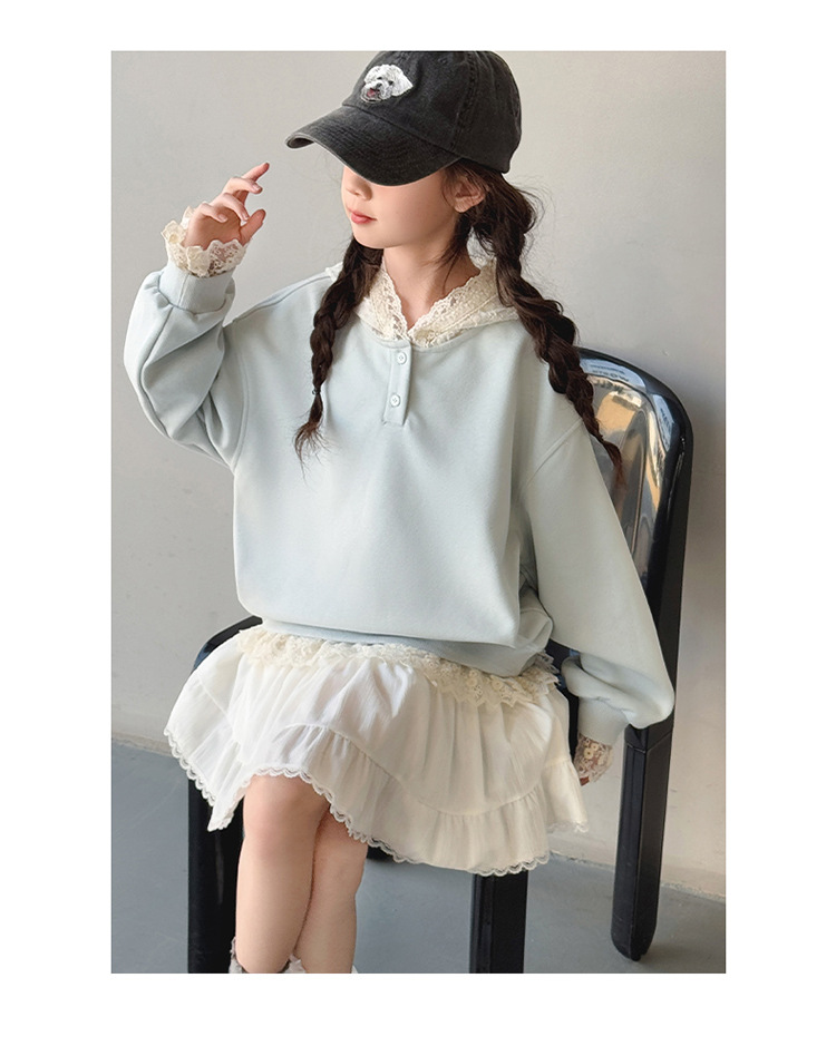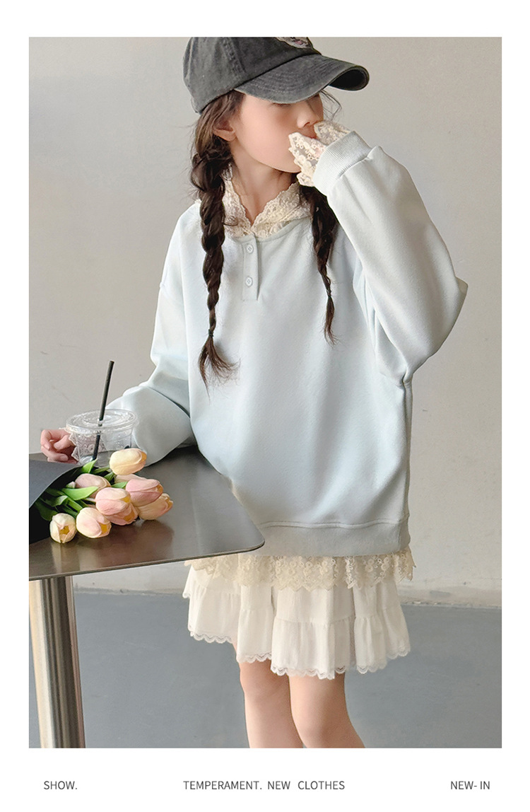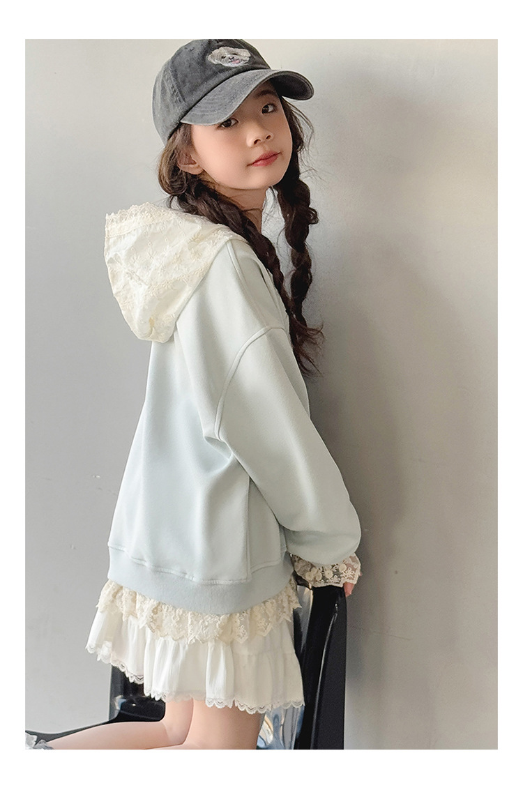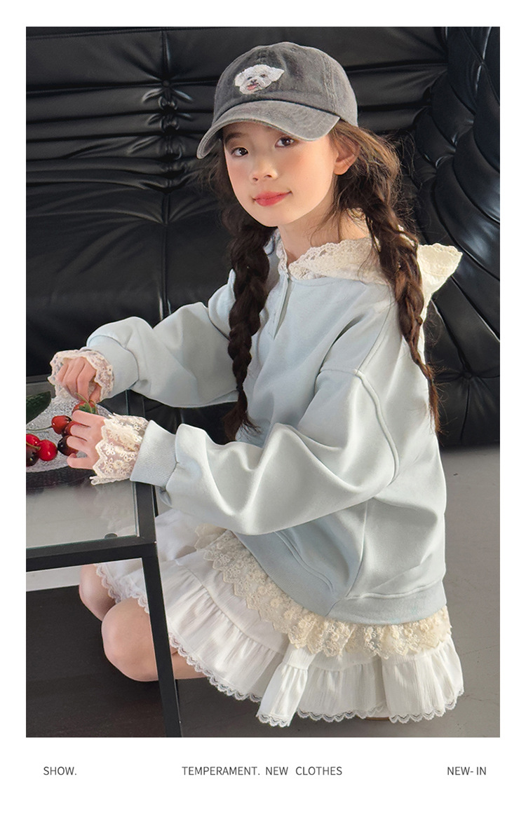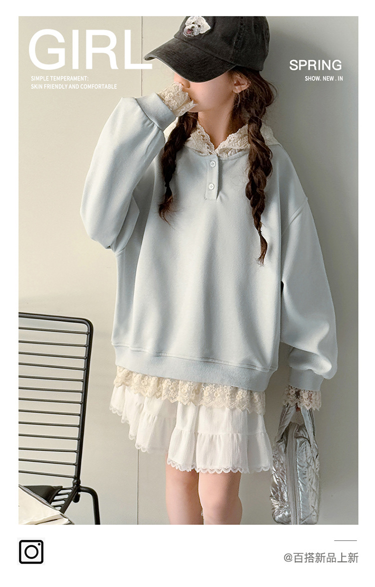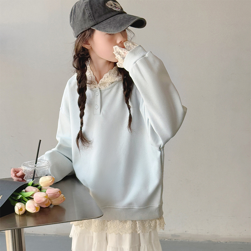 소녀 스웨터 봄 2025 아동복 도매 소녀 레이스 후드 스티칭 긴 소매 크루 넥 탑 티셔츠 캐주얼스토어 가기