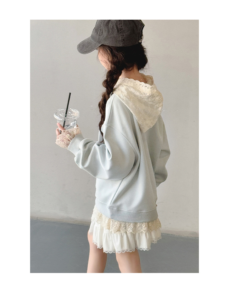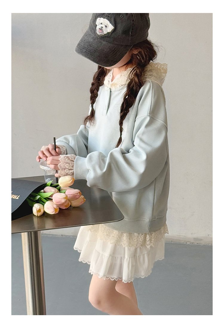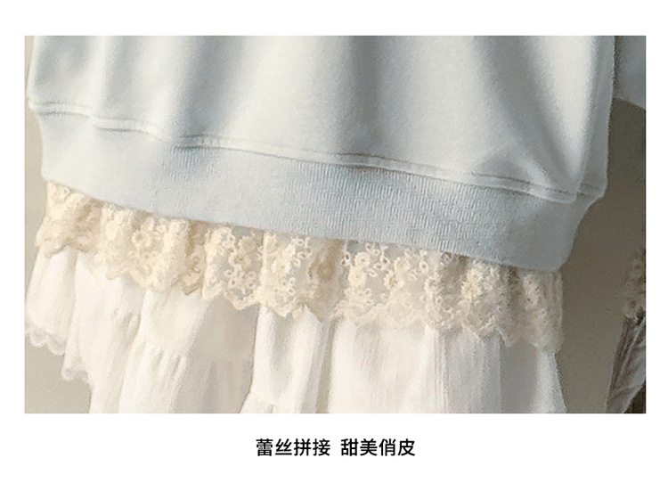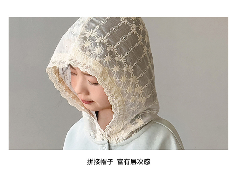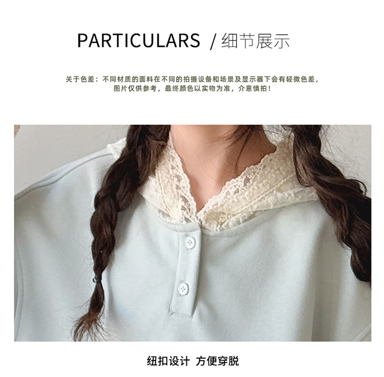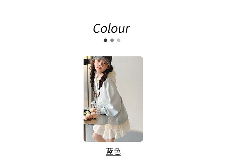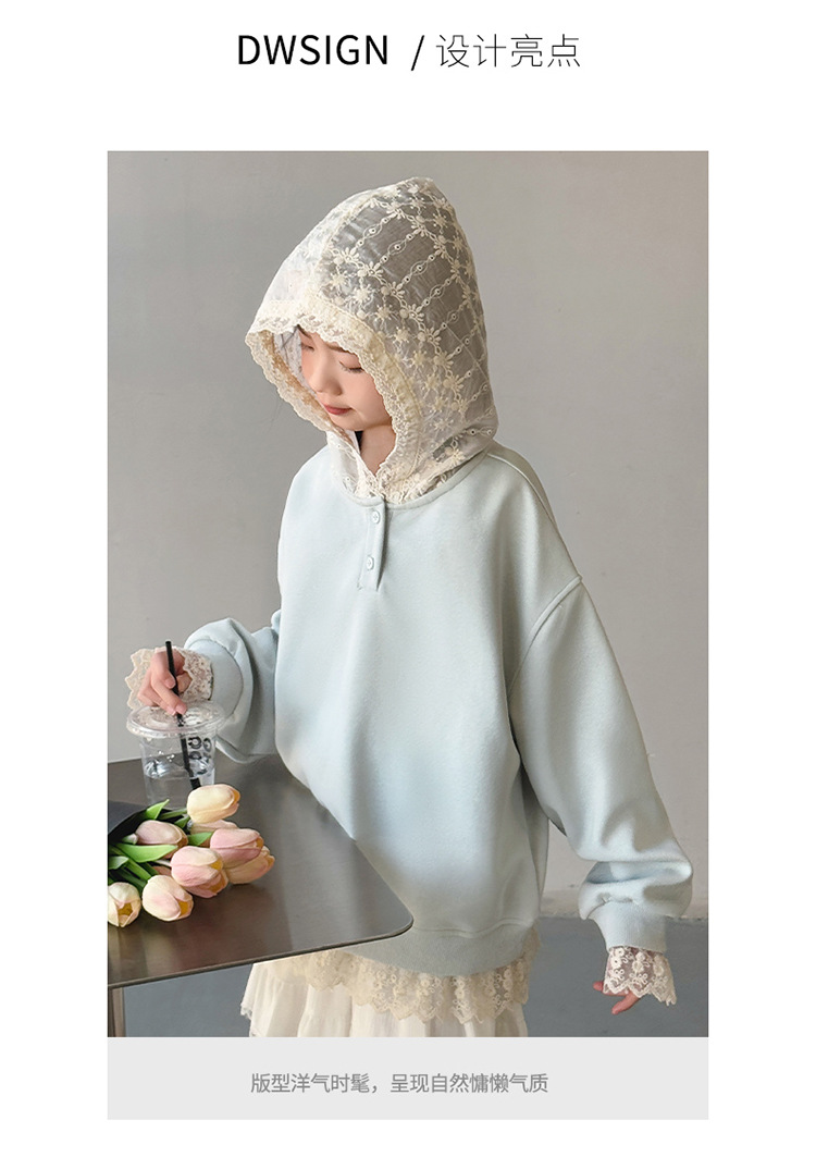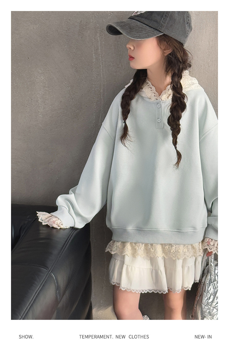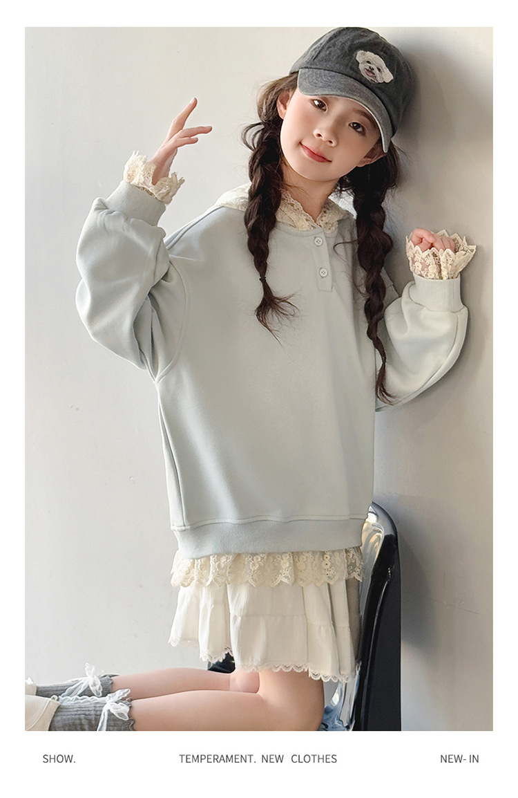 소녀 스웨터 봄 2025 아동복 도매 소녀 레이스 후드 스티칭 긴 소매 크루 넥 탑 티셔츠 캐주얼스토어 가기
