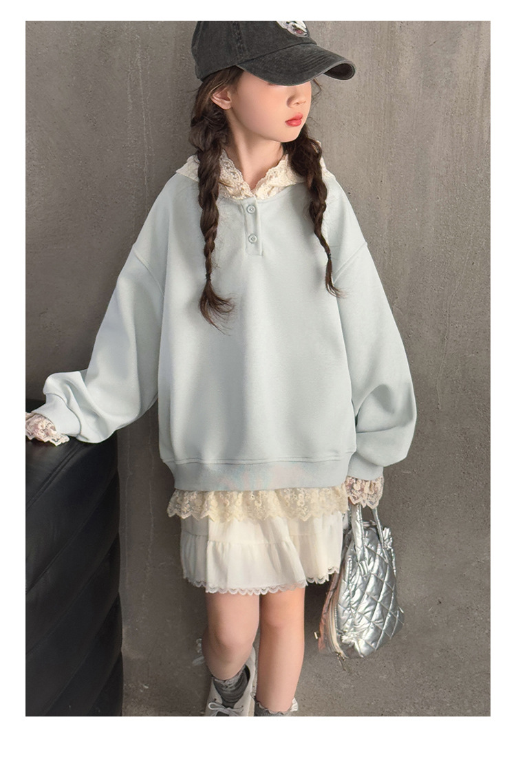 소녀 스웨터 봄 2025 아동복 도매 소녀 레이스 후드 스티칭 긴 소매 크루 넥 탑 티셔츠 캐주얼