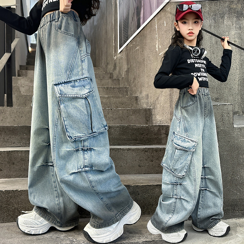 소녀의 봄 청바지 2025 새로운 세련된 유행 바지 큰 어린이 봄 소녀의 느슨한 넓은 다리 바지스토어 가기