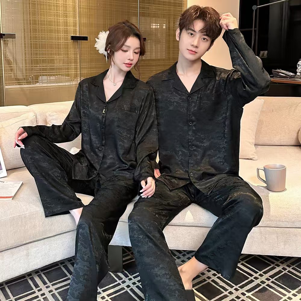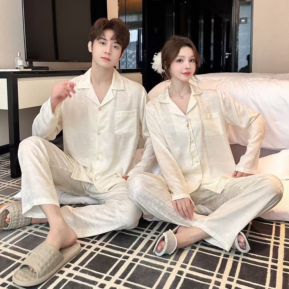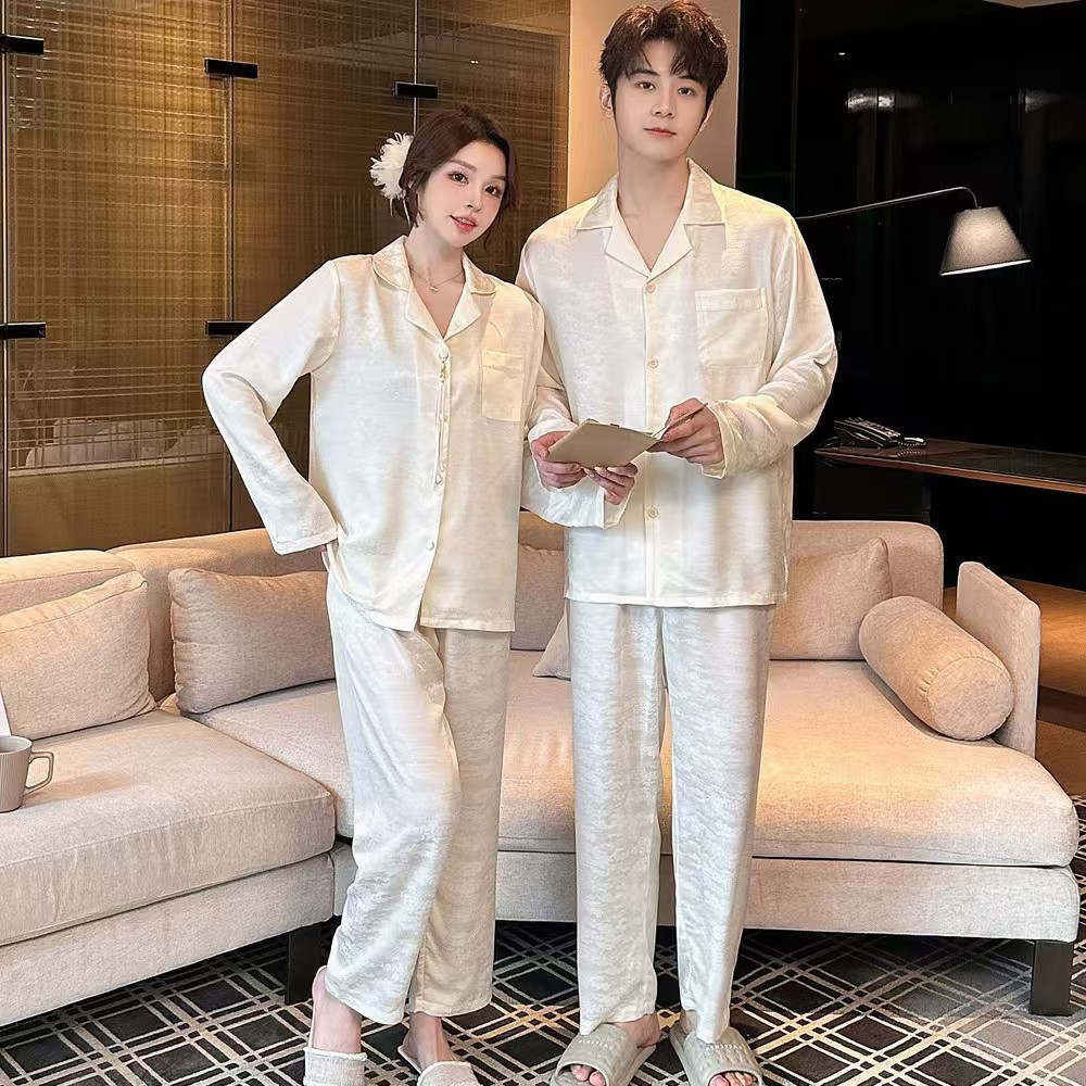 2025 새로운 아이스 실크 커플 잠옷 봄 고급 고귀한 긴 소매 바지 세트 얇은 외부 착용