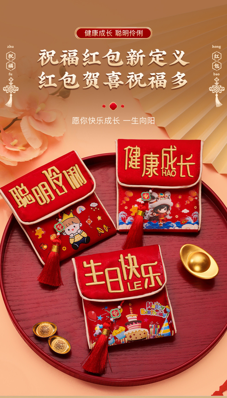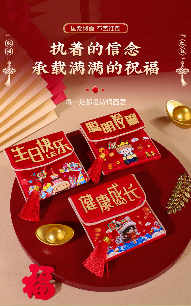 • [건강한 성장] 술 자수 패브릭 빨간 봉투