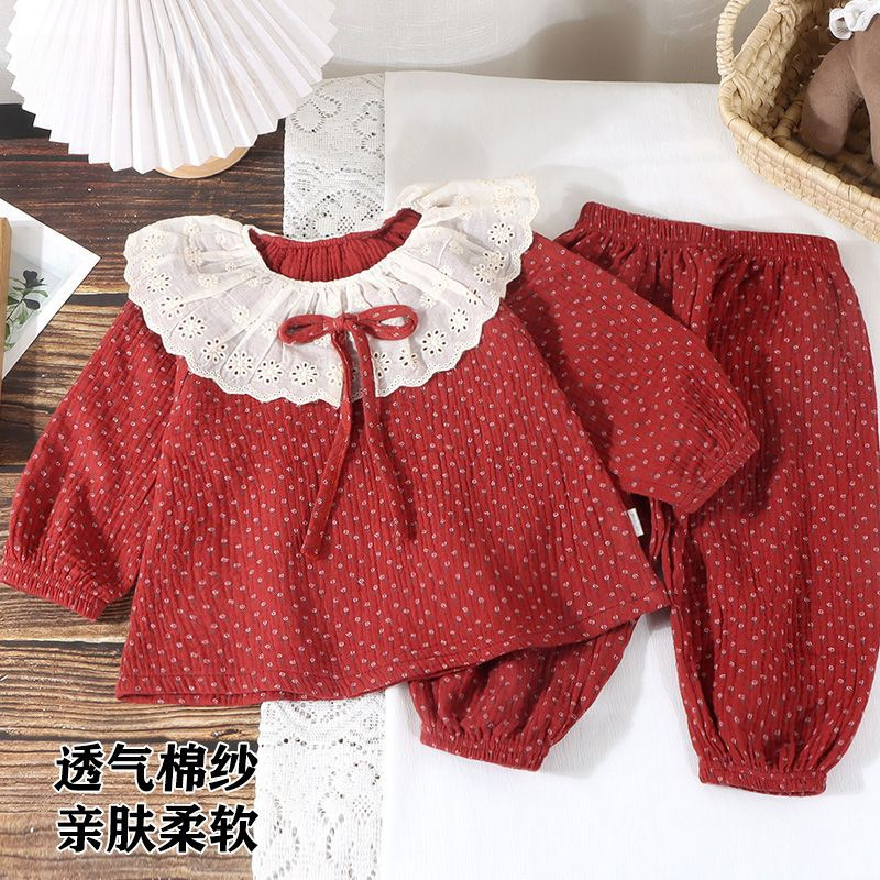 여자 면 원사 잠옷 어린이 봄과 여름 면 레이스 홈 옷 여성의 보물 얇은 더블 거즈 달콤한 속옷 가을