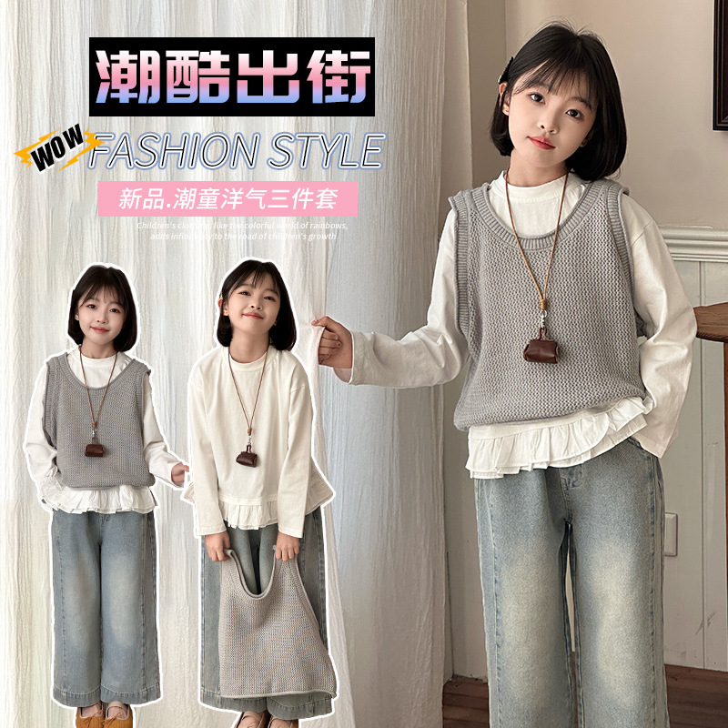 570 봄 가을 신상품 2025 여아 세트 중형 스웨터 조끼 흰색 셔츠 청바지 3종 세트 아동복
