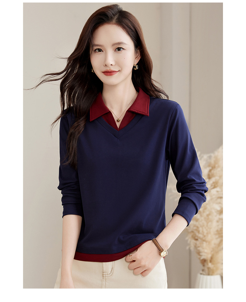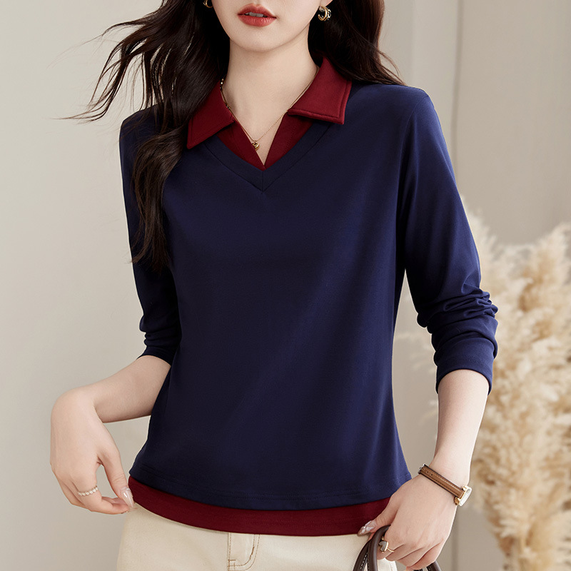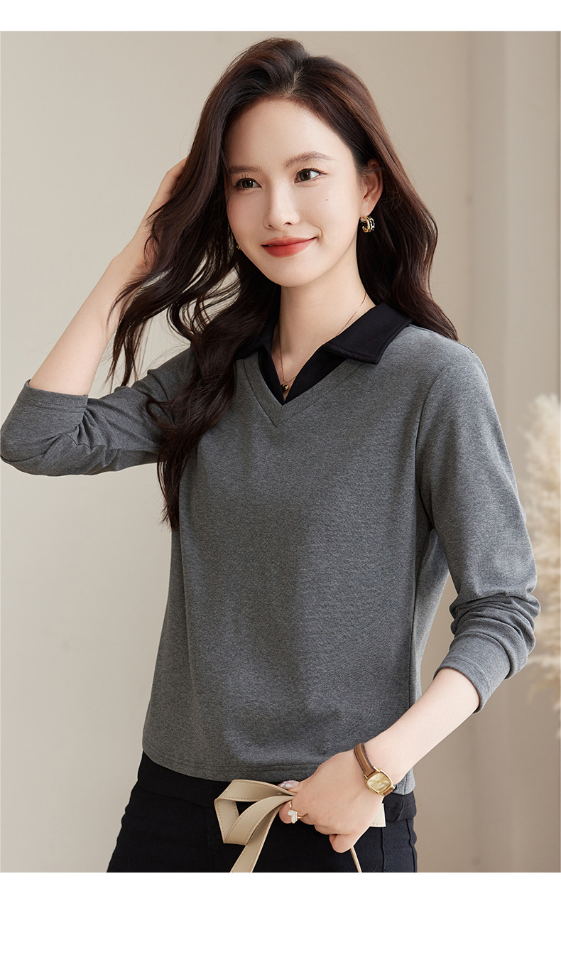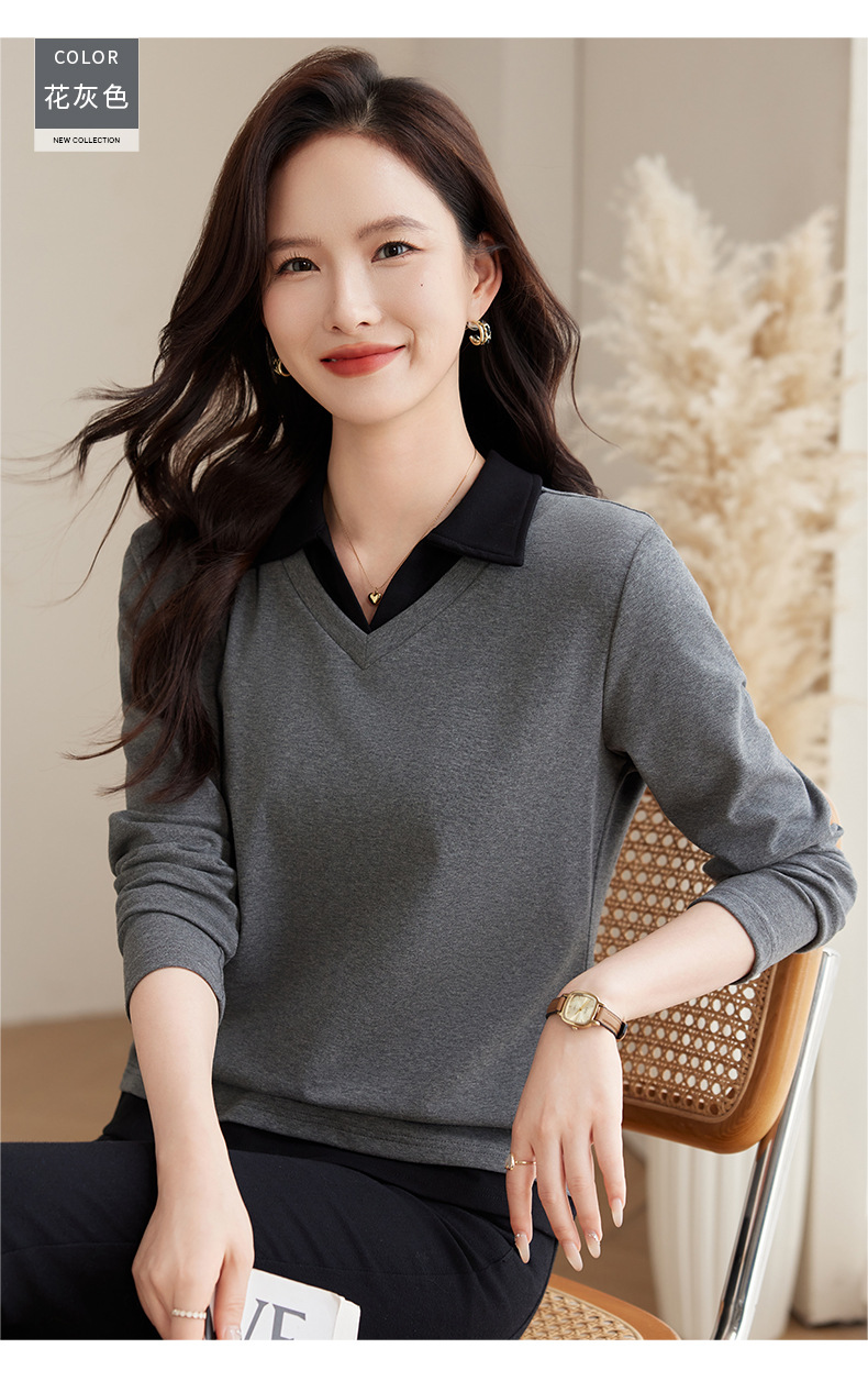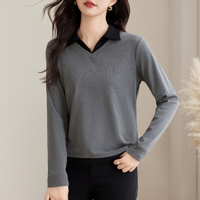 카운터 브랜드 하이 엔드 봄과 가을 여성 티셔츠 긴 소매 작은 옷깃 세련된 올 매치 코튼 V 넥 얇은 여성용 탑