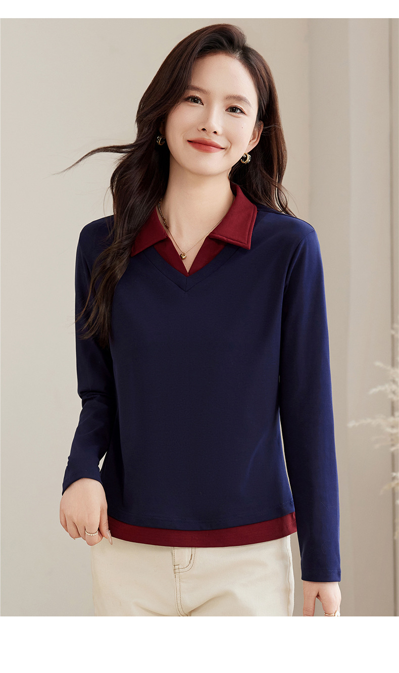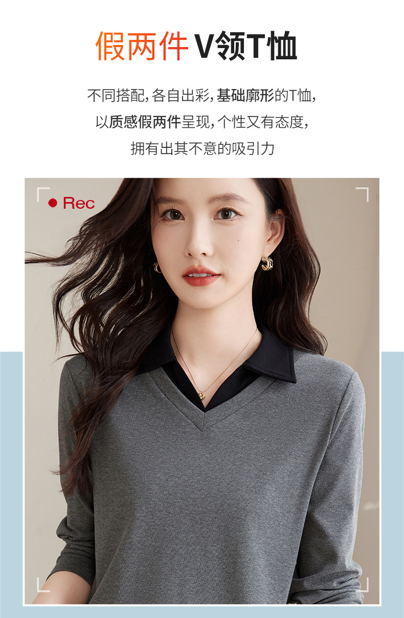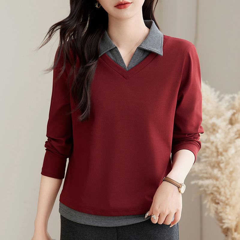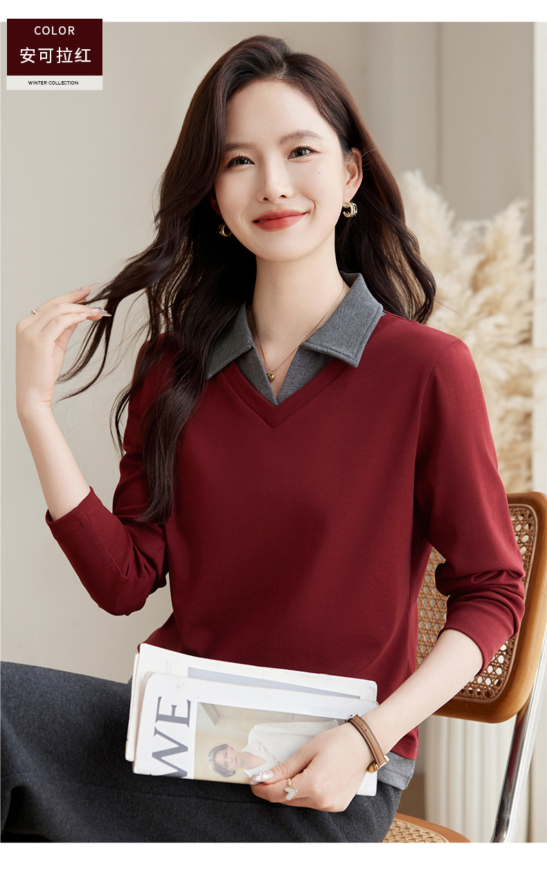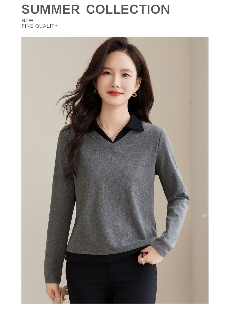카운터 브랜드 하이 엔드 봄과 가을 여성 티셔츠 긴 소매 작은 옷깃 세련된 올 매치 코튼 V 넥 얇은 여성용 탑