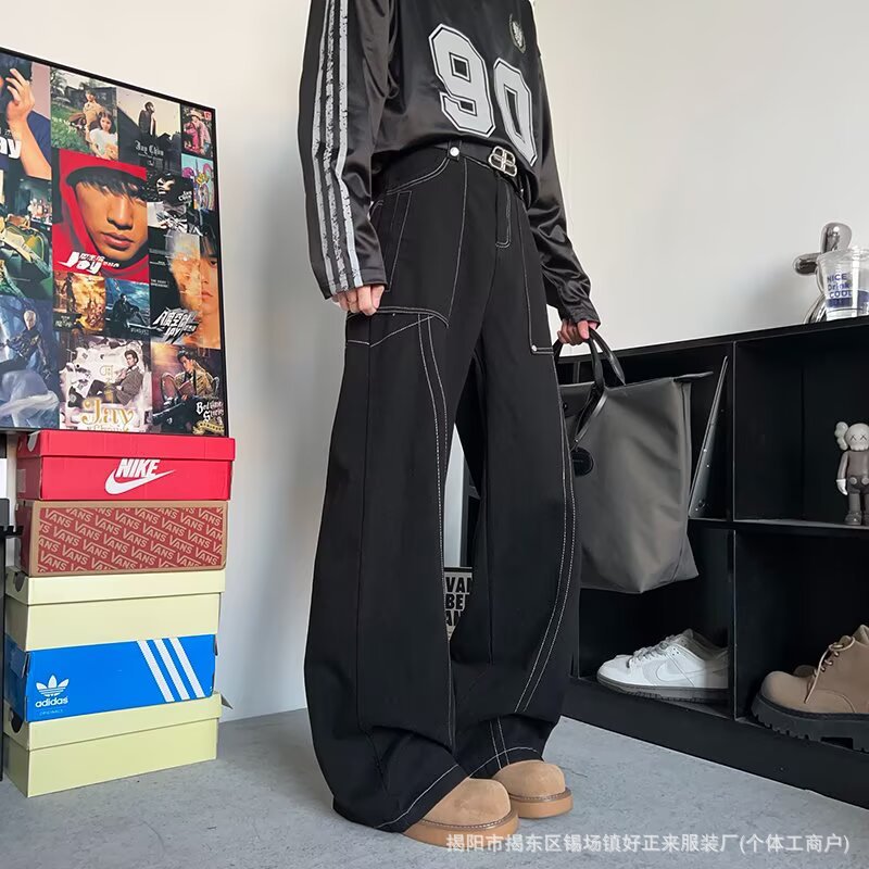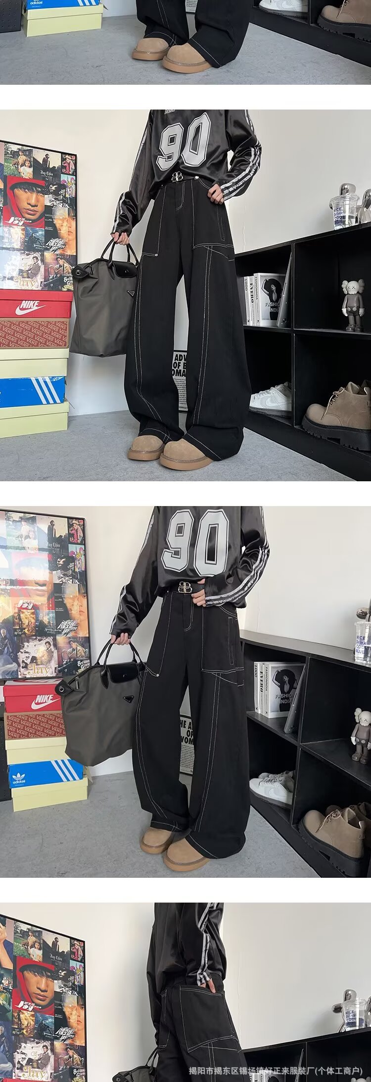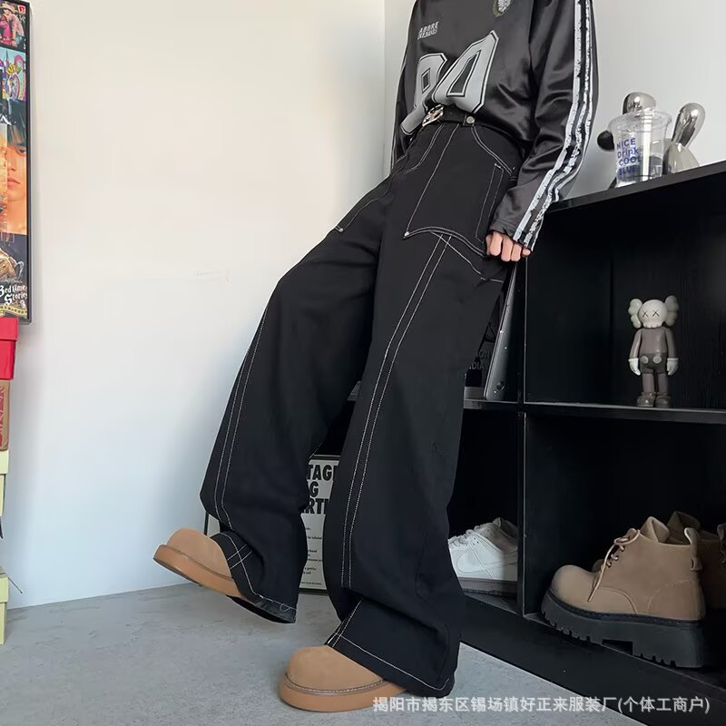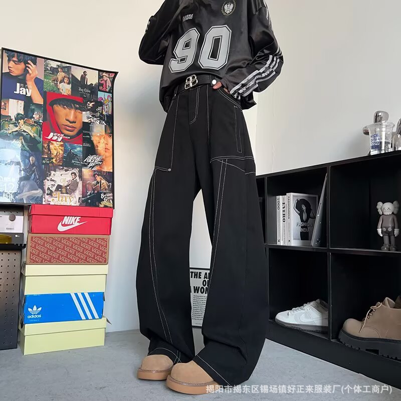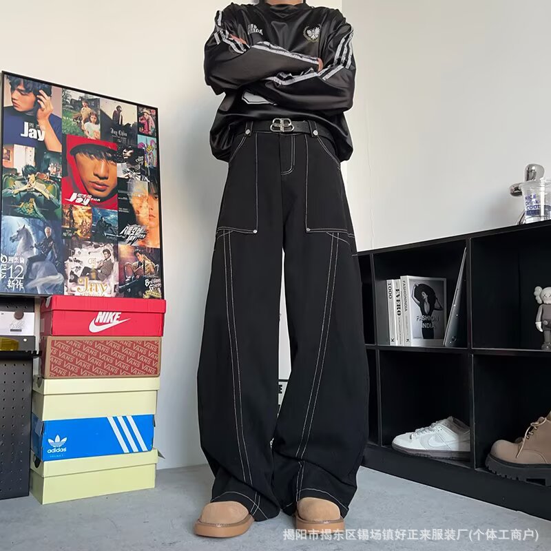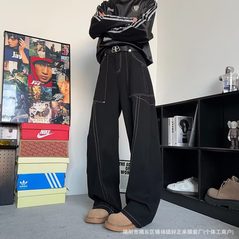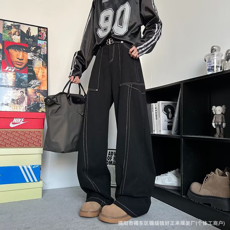 2025 봄 새로운 오픈 라인 디자인 센스 툴링 청바지 남성 아메리칸 스타일 레트로 느슨한 슬리밍 스트레이트 레그 와이드 레그 바지스토어 가기
