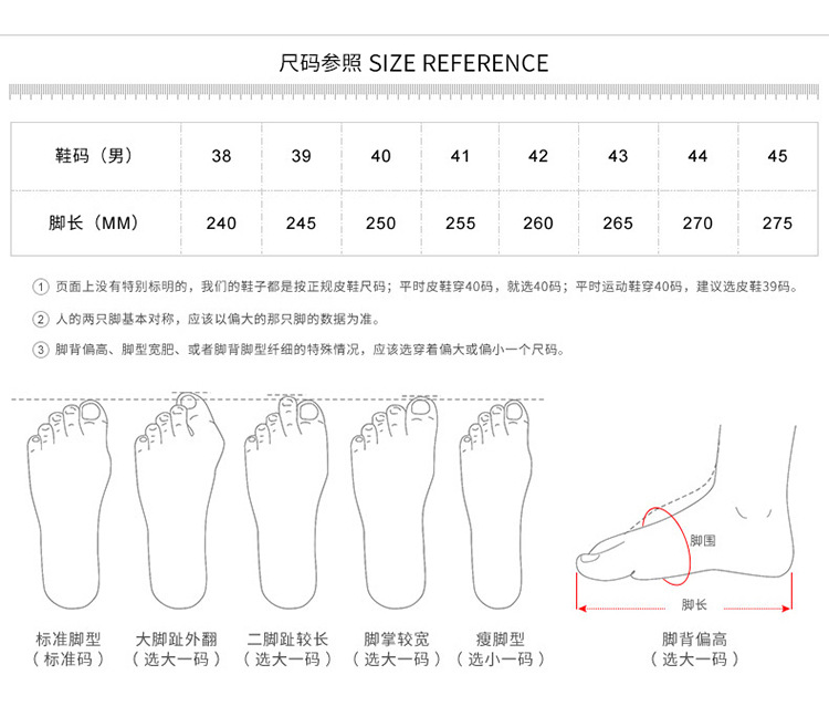 尺码选择:客户1:我没有穿过皮鞋,平时运动鞋穿42,这款穿多大?回答:这款穿41既可。客户2:我平时皮鞋,运动鞋穿41,这款穿多大?回答:这款穿41既可。客户3:我皮鞋40.41都穿过,这款怎么选?回答:这款穿40既可。