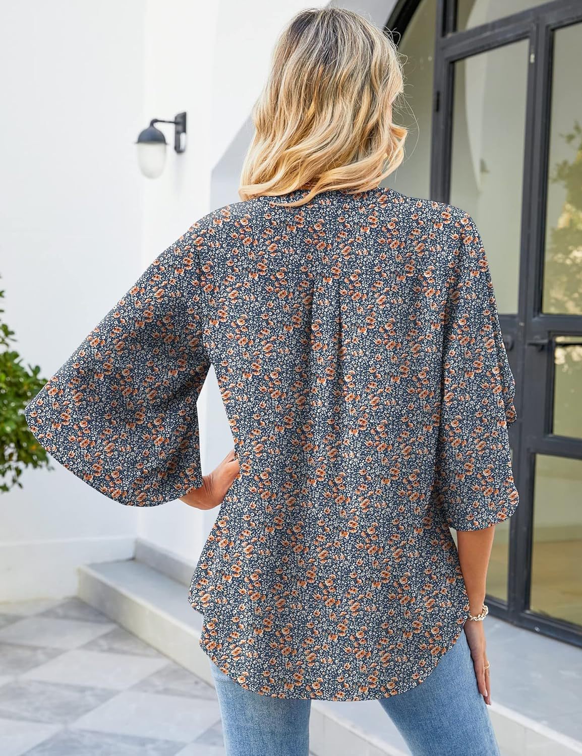 2025 국경 아마존 여름과 가을 새로운 여성 최고 느슨한 V 넥 꽃잎 시폰 인쇄 여성 셔츠스토어 가기