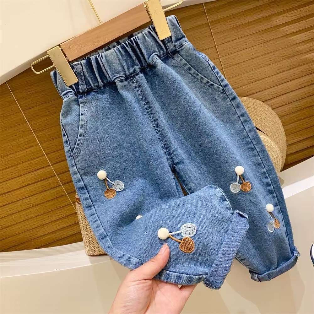2025 한국판 봄 가을 여아 만화 자수 루즈핏 와이드 데님 팬츠 아동용 긴바지 유아동용스토어 가기