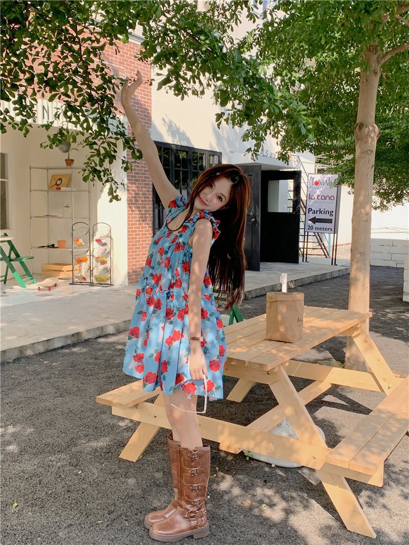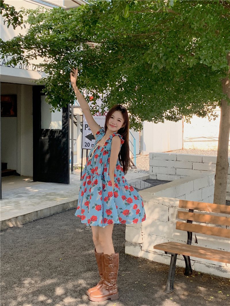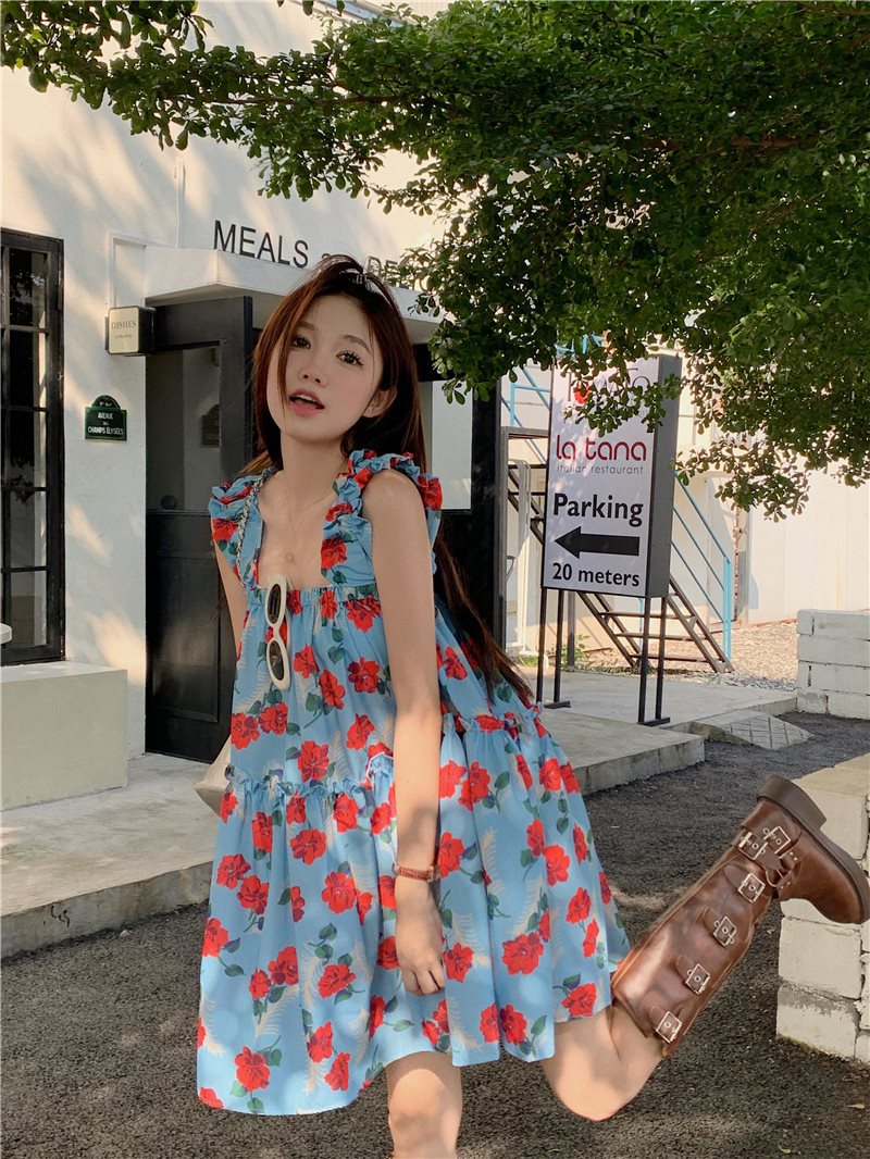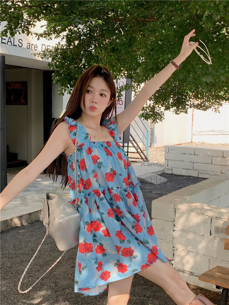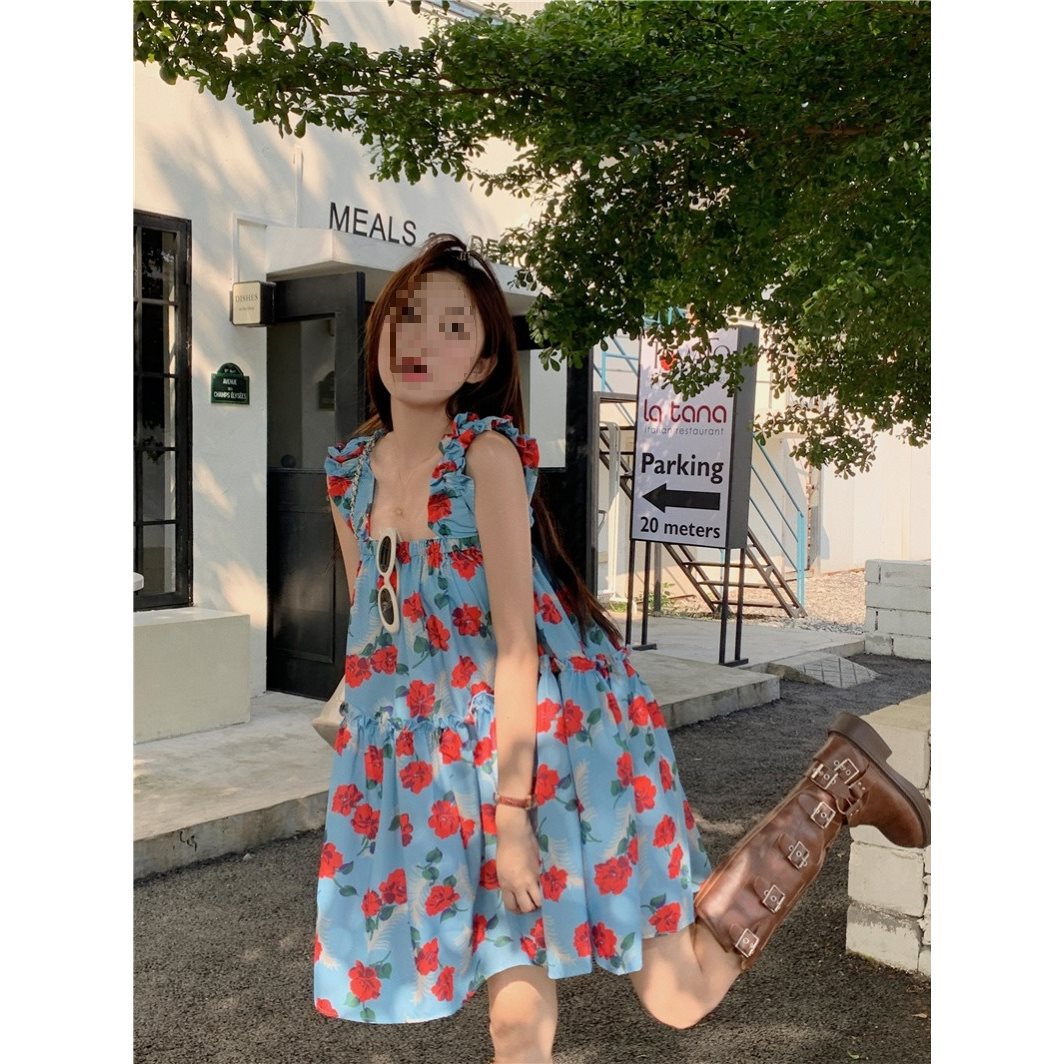 빈티지 나무 귀 꽃 치마 슬링 원피스 여성용 여름 느슨한 슬리밍 해변 휴가 달콤한 짧은 치마스토어 가기