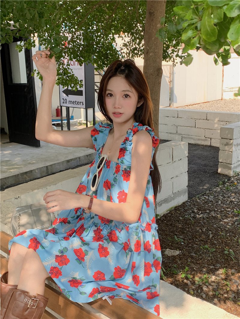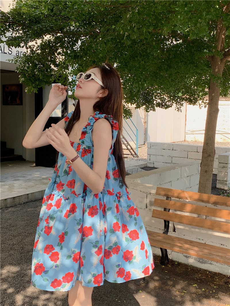 빈티지 나무 귀 꽃 치마 슬링 원피스 여성용 여름 느슨한 슬리밍 해변 휴가 달콤한 짧은 치마