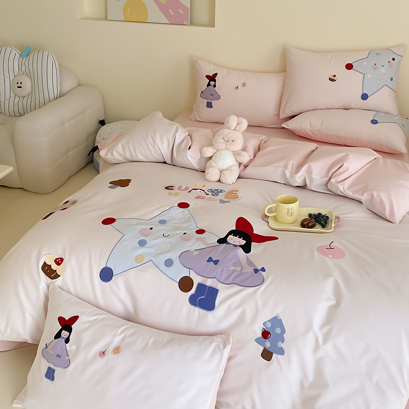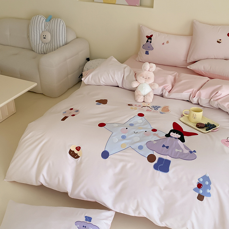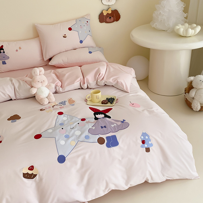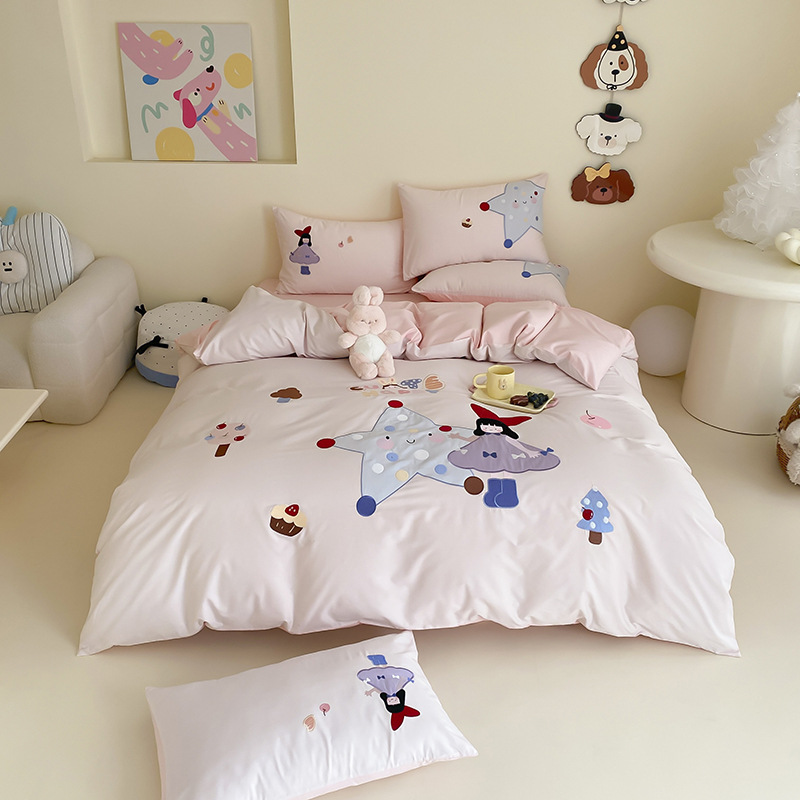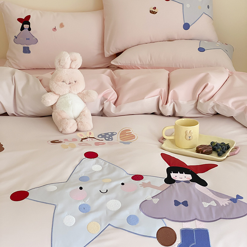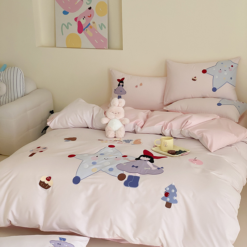 귀여운 만화 코튼 4 피스 세트 수 놓은 다섯개의 별 소녀 면 퀼트 커버 침대 시트 3 피스 세트 학생 기숙사스토어 가기