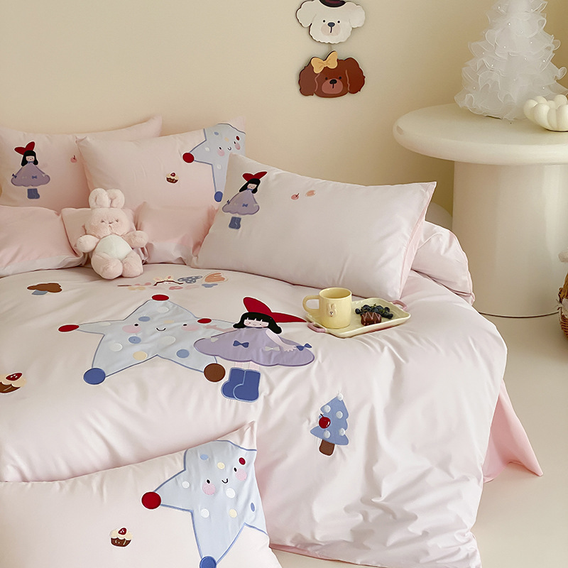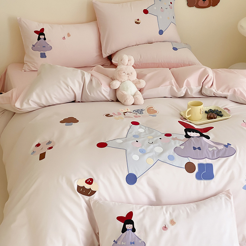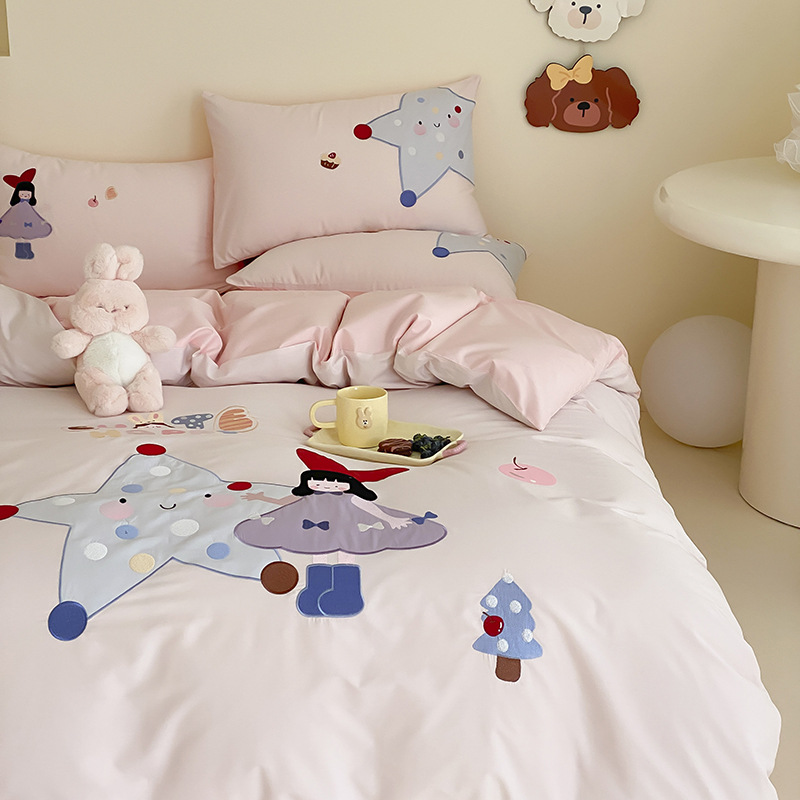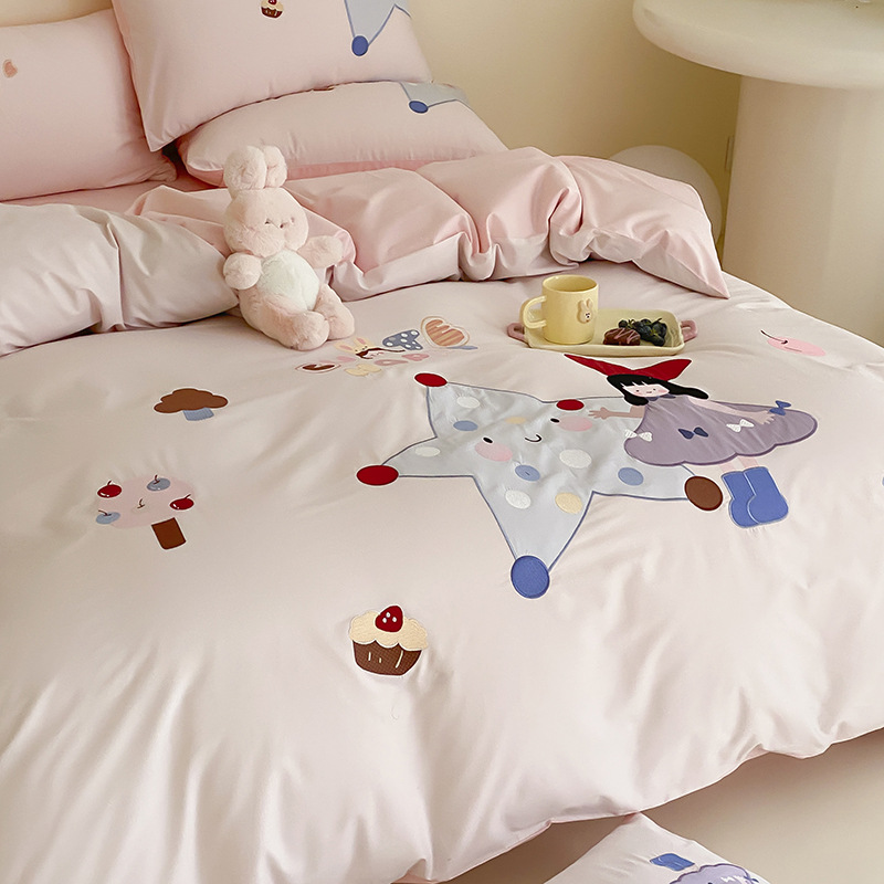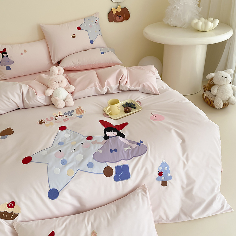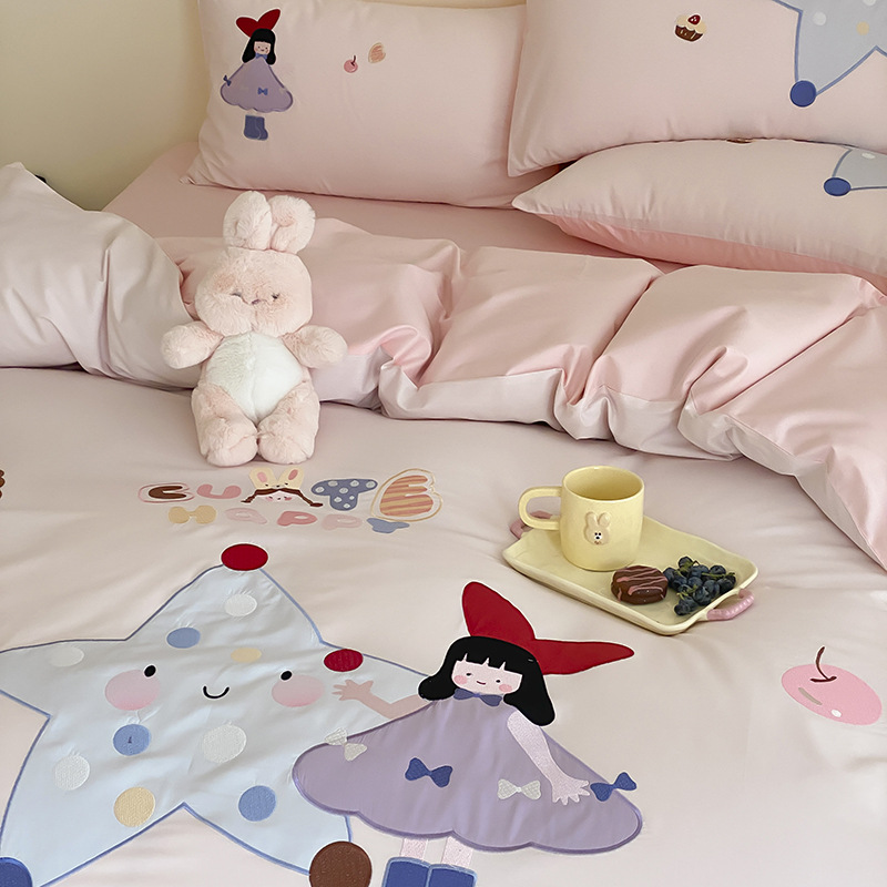 귀여운 만화 코튼 4 피스 세트 수 놓은 다섯개의 별 소녀 면 퀼트 커버 침대 시트 3 피스 세트 학생 기숙사스토어 가기