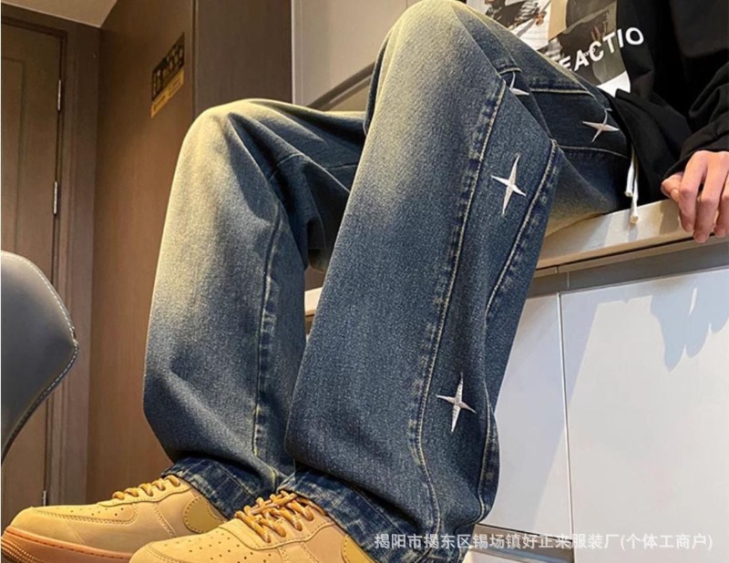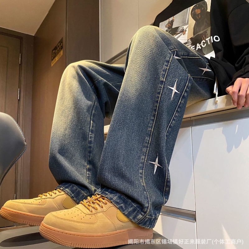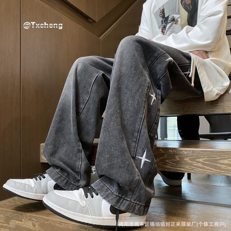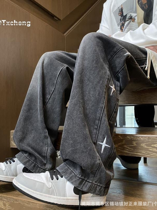 미국식 하이 스트리트 힙합 스타 자수 청바지 남성 봄과 가을 여름 얇은 느슨한 스트레이트 롱 바지