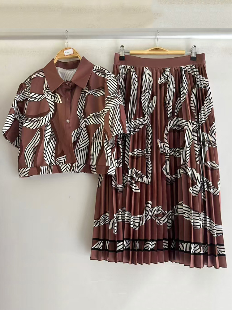 국경 간 대외 무역 여성 복고풍 기하학적 인쇄 짧은 셔츠 투피스 높은 허리 주름 치마 패션 세트