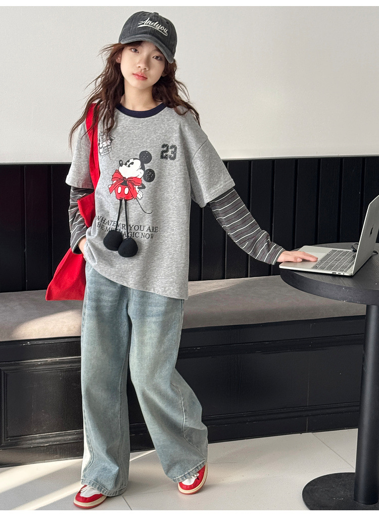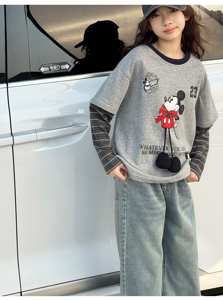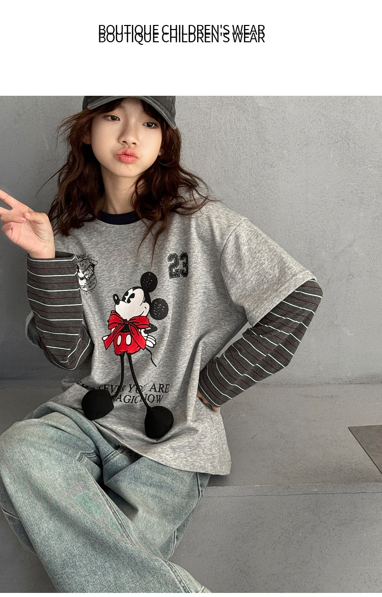 여자 긴팔 티셔츠 2025 가을 새로운 스타일 어린이 패치 워크 슬리브 탑 한국 스타일 큰 어린이 바닥 셔츠 봄, 가을 유행 t스토어 가기