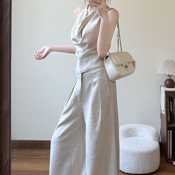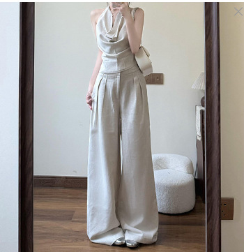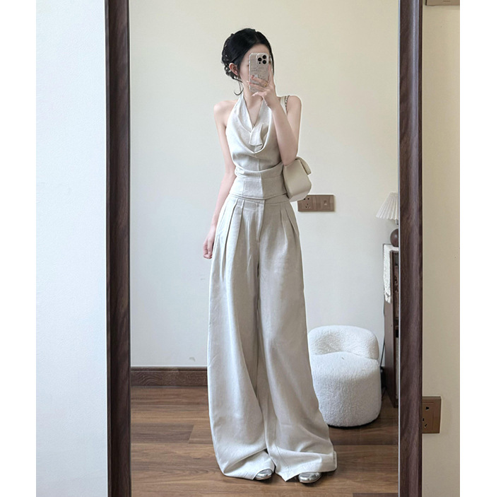 순수 스파이스 소녀 스타일 하이 엔드 스윙 칼라 교수형 넥 레이스 업 최고의 여성 봄과 여름 새로운 캐주얼 와이드 레그 바지 세트