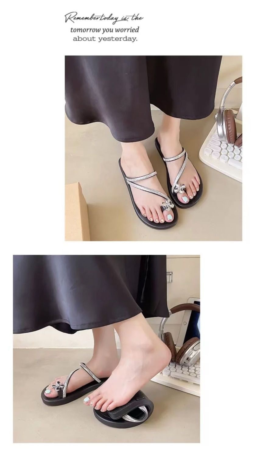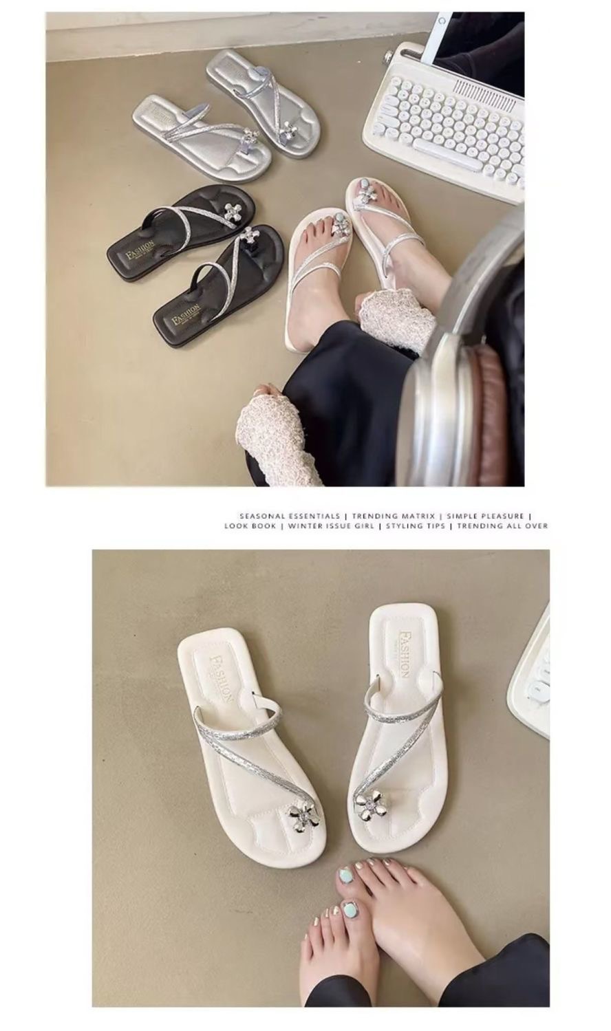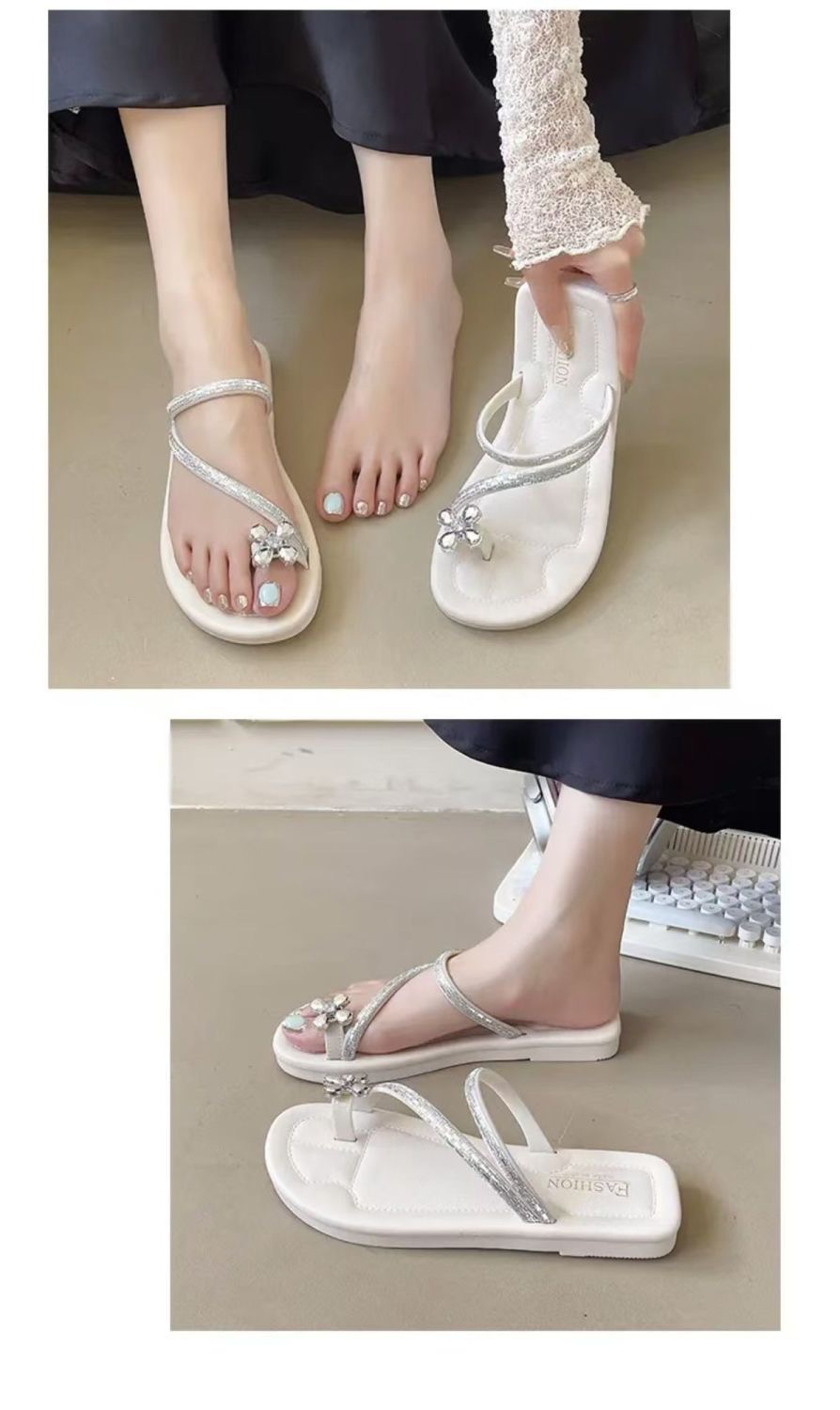 2025 새로운 중국 스타일 플랫 프렌치 샌들 여성 아우터웨어 여름 라인석 꽃 부드러운 밑바닥 미끄럼 방지 비치 플립 플롭스토어 가기