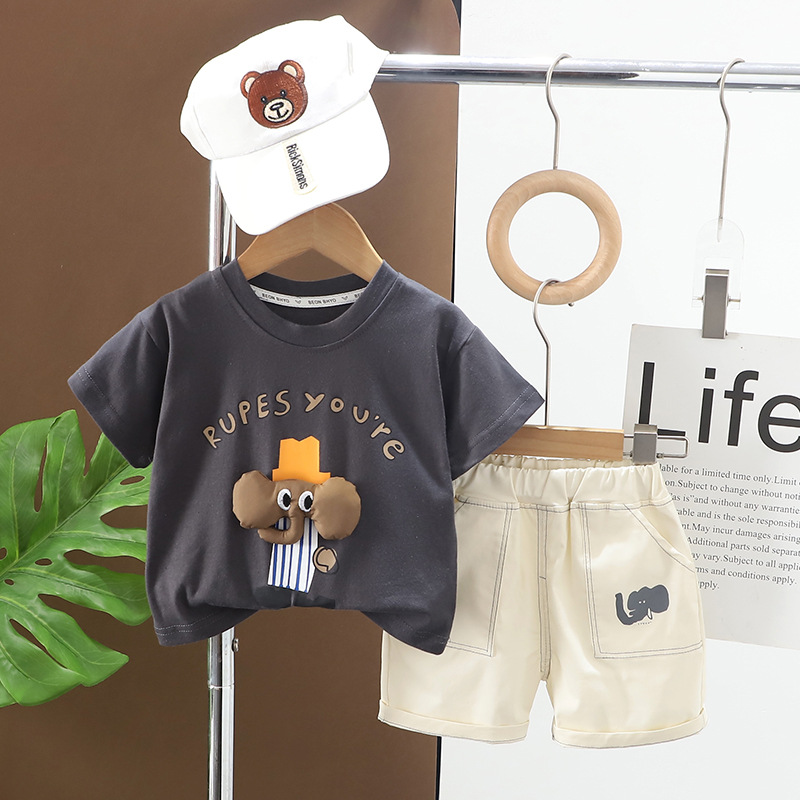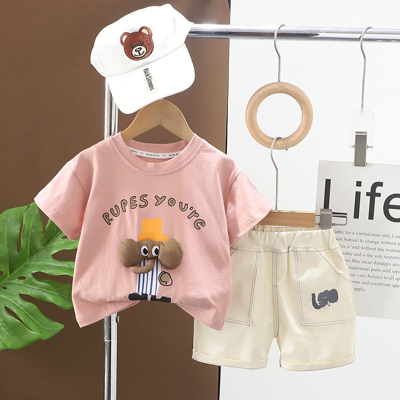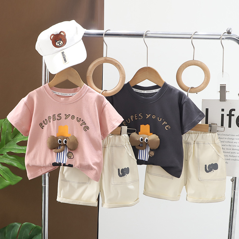 2025 년 여름 소년 한국 스타일 아동복 반팔 만화 코끼리 투피스 여름 원피스 어린이 세트 유행 머리