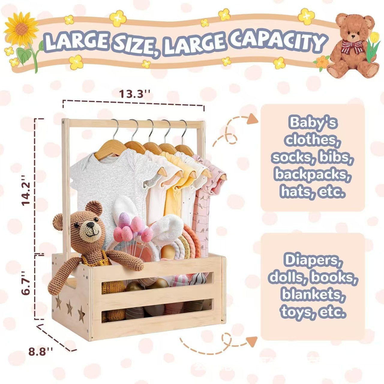 나무로 만든 아기용품 수납함, 옷과 장난감 수납 바구니, 침실 아기옷 걸이대, 원목 잡화 바구니스토어 가기