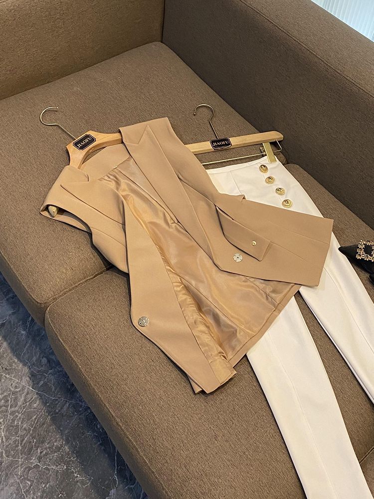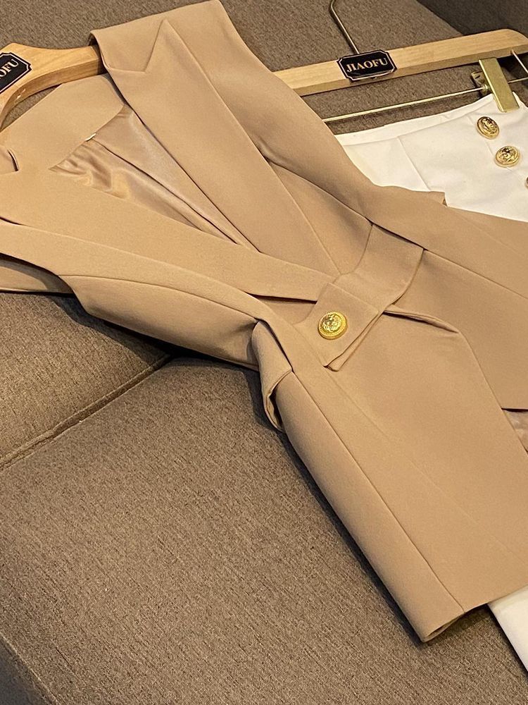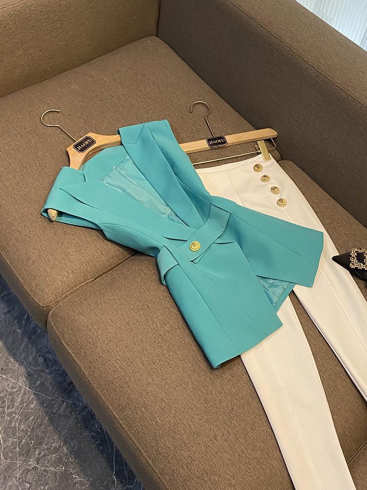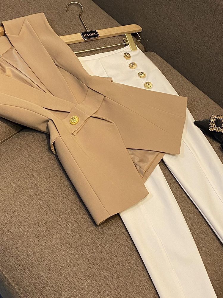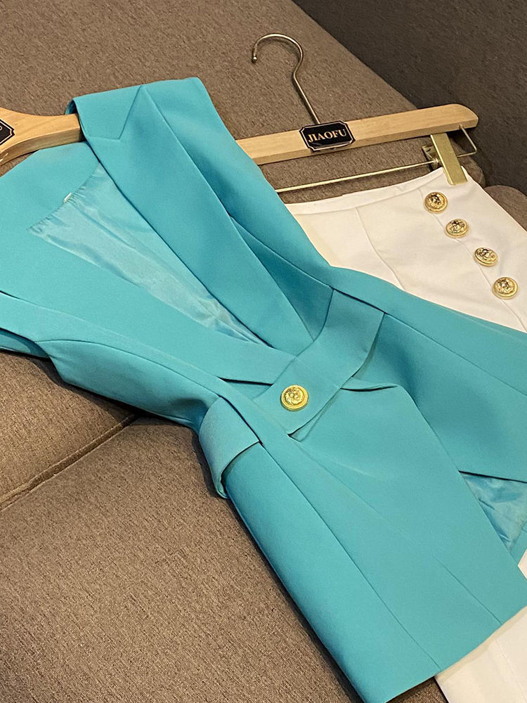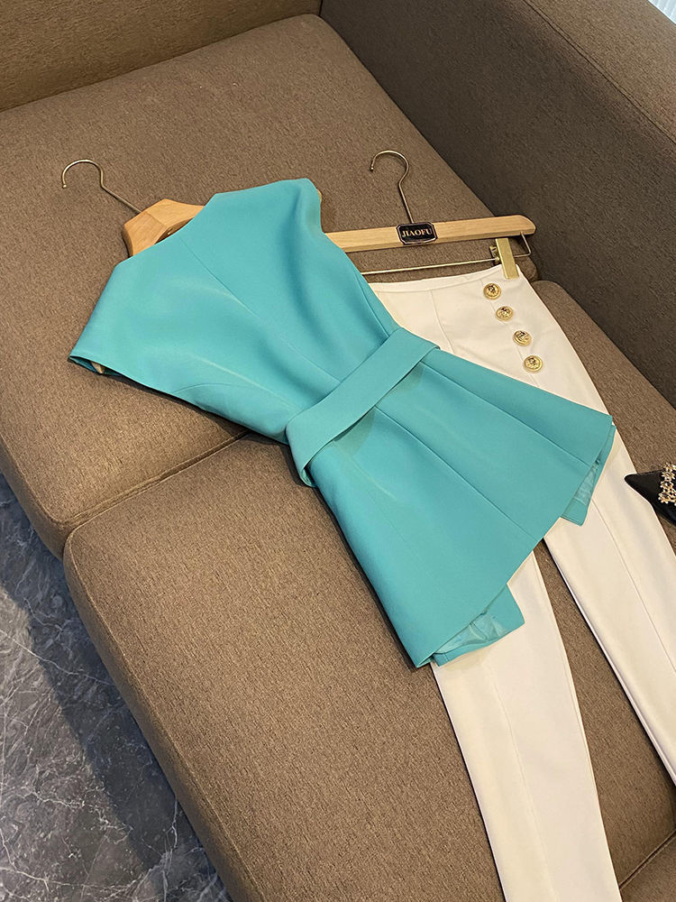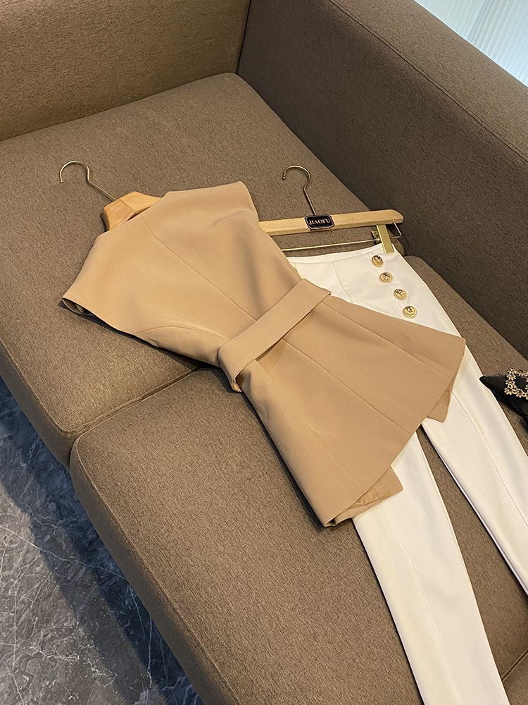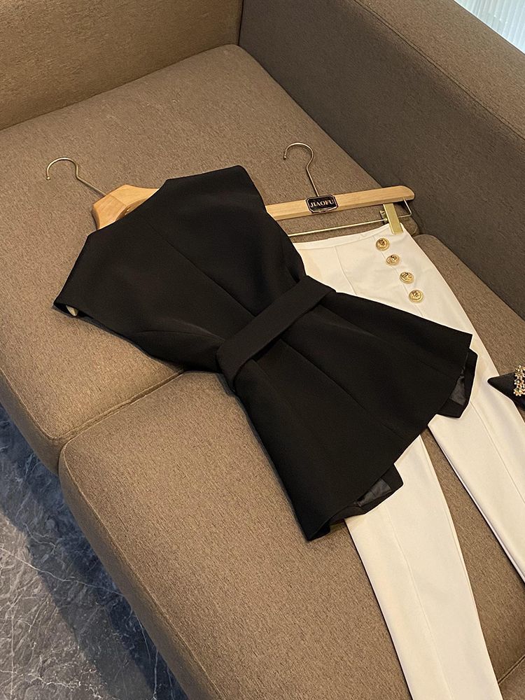 봄 2024 폭발 패션 새로운 디자인 벨트 민소매 슬림 핏 에어 세트 조끼 여성 조끼