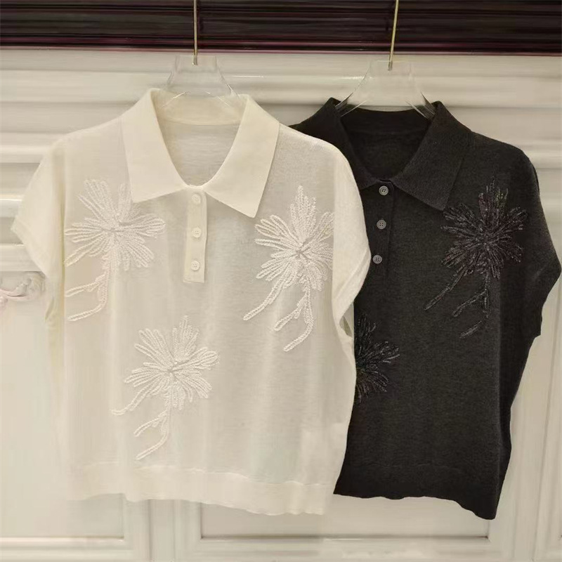 BC 중공업, 꽃 속편 엘 실크 울 니트 셔츠 여성용 느슨한 슬리밍 반팔 티셔츠 얇은 탑스토어 가기