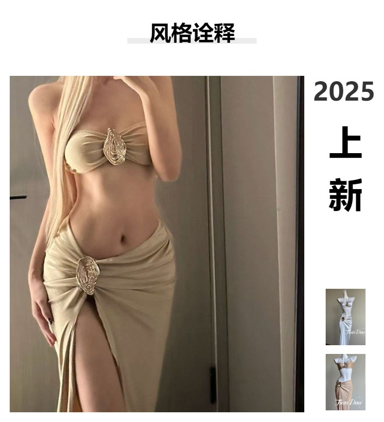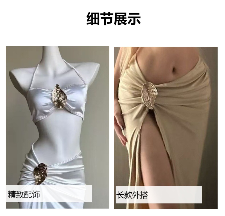 비키니 새로운 유럽과 미국 스타일의 금속 주름 튜브 탑 푸시 업 섹시한 아름다운 백 스플릿 긴 원피스 수영복 여성용 3 피스 세트