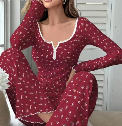 국경 간 폭발 유럽과 미국 스타일의 가을 및 겨울 홈 옷 섹시한 캐주얼 패션 긴 소매 바지 여성용 파자마 투피스 세트