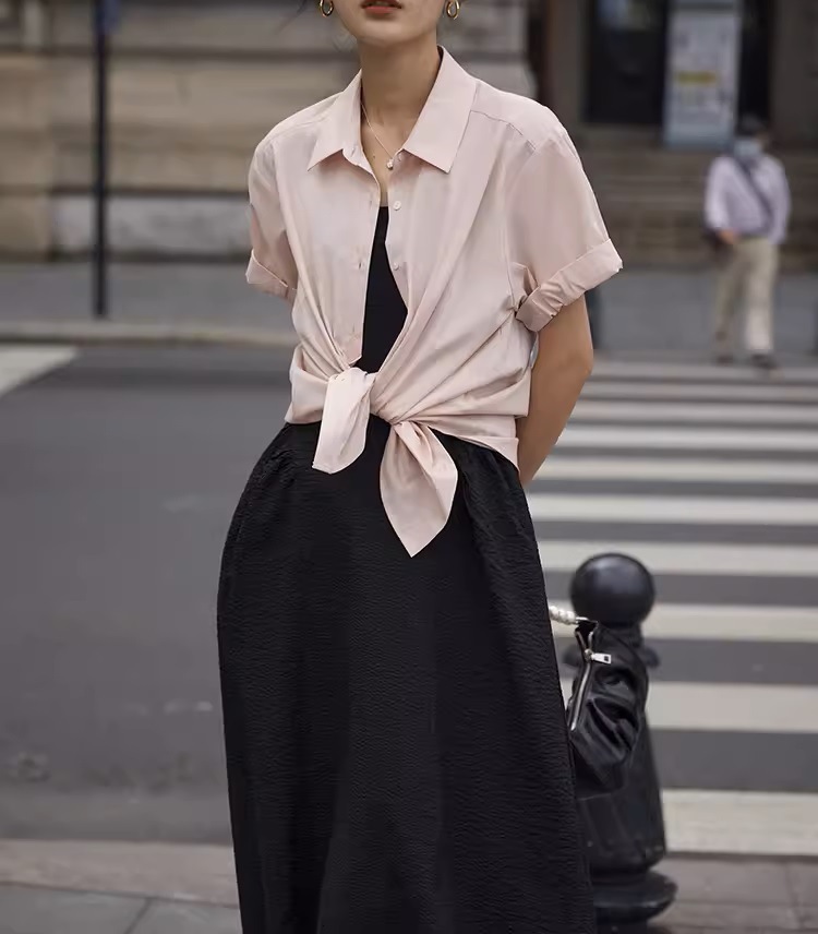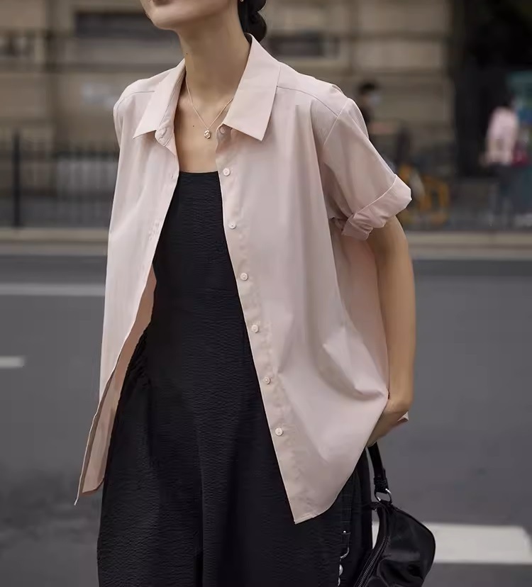 핑크 반팔 셔츠 여성 여름 얇은 간단한 통근 슬림 셔츠 2025 새로운 스타일 작은 패션 탑스토어 가기