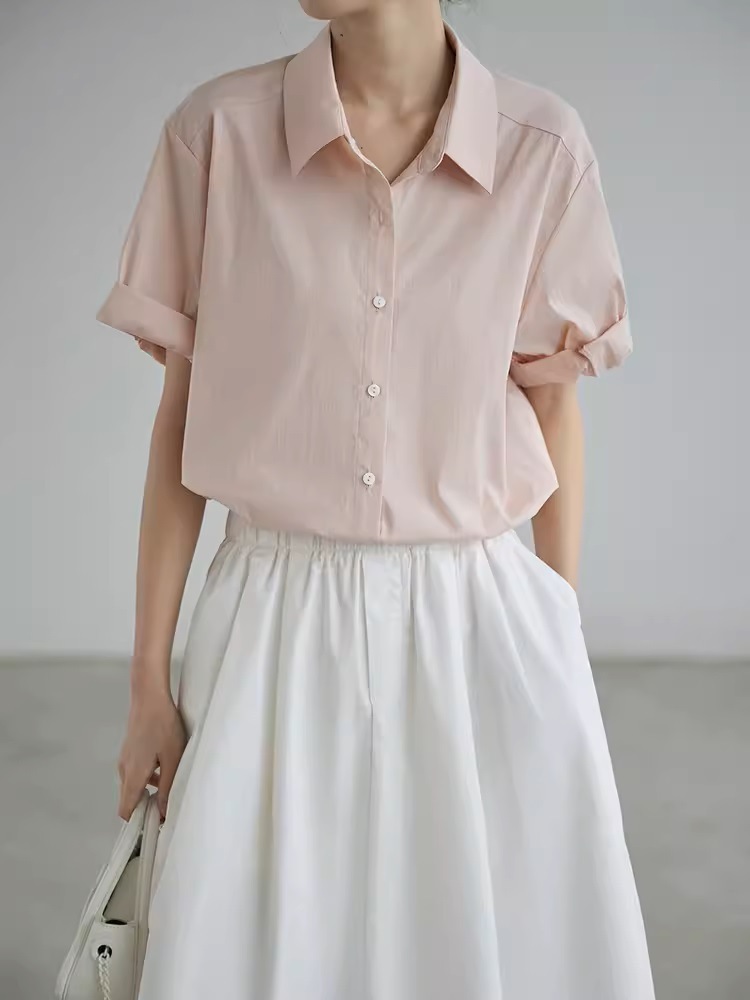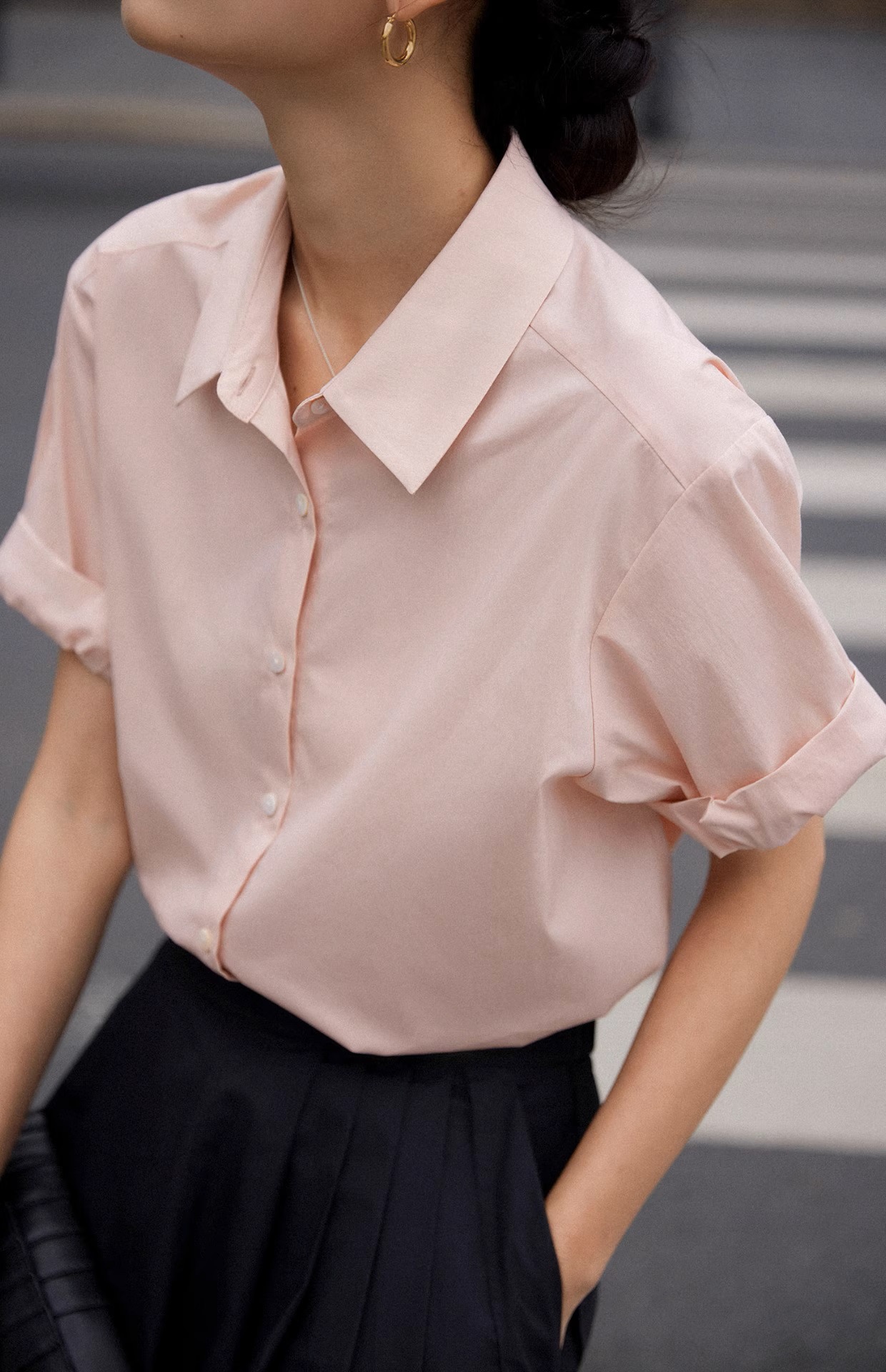 핑크 반팔 셔츠 여성 여름 얇은 간단한 통근 슬림 셔츠 2025 새로운 스타일 작은 패션 탑