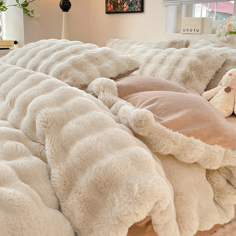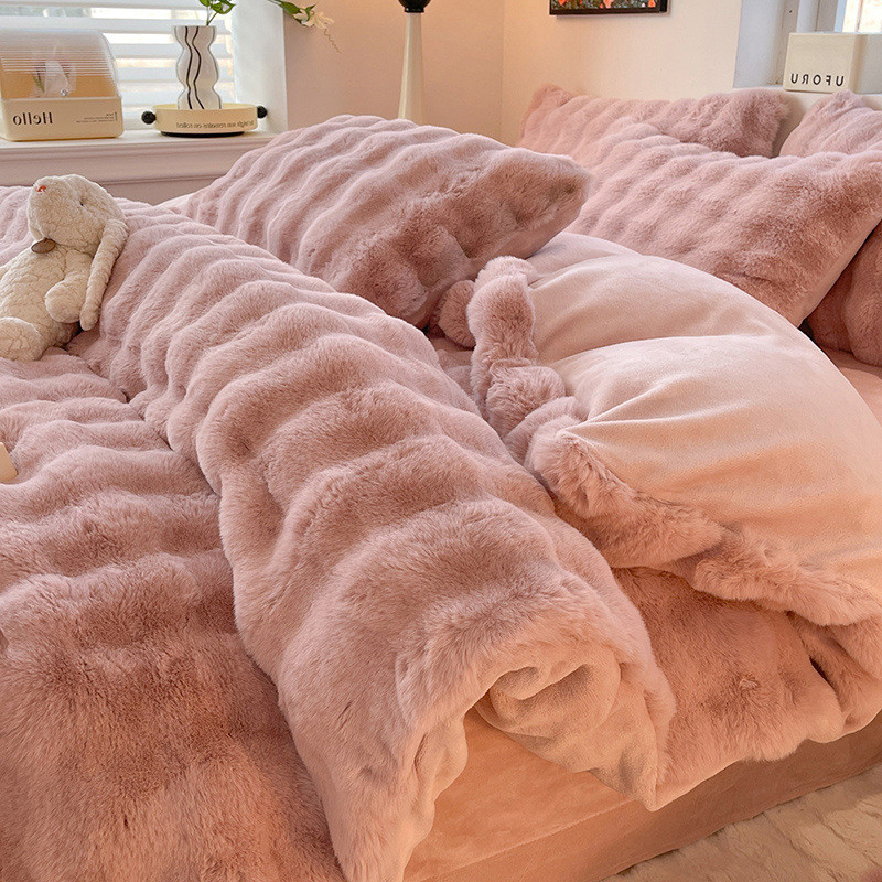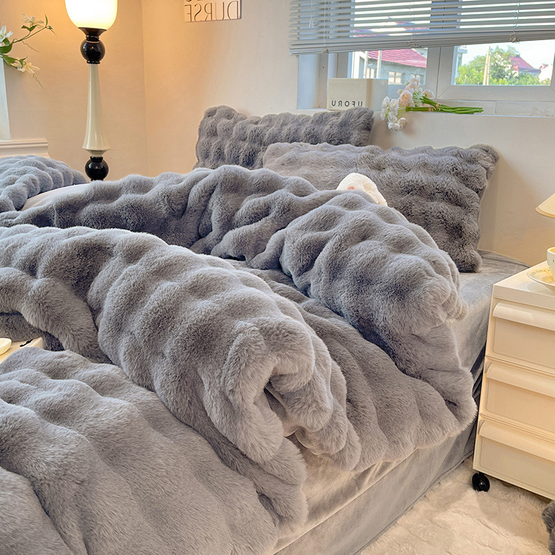 A 급 고중량 토끼 모피 4 종 세트 겨울 빛 럭셔리 버블 밀크 벨벳 기숙사 이불 커버 3 종 세트 8 진 양면 벨벳