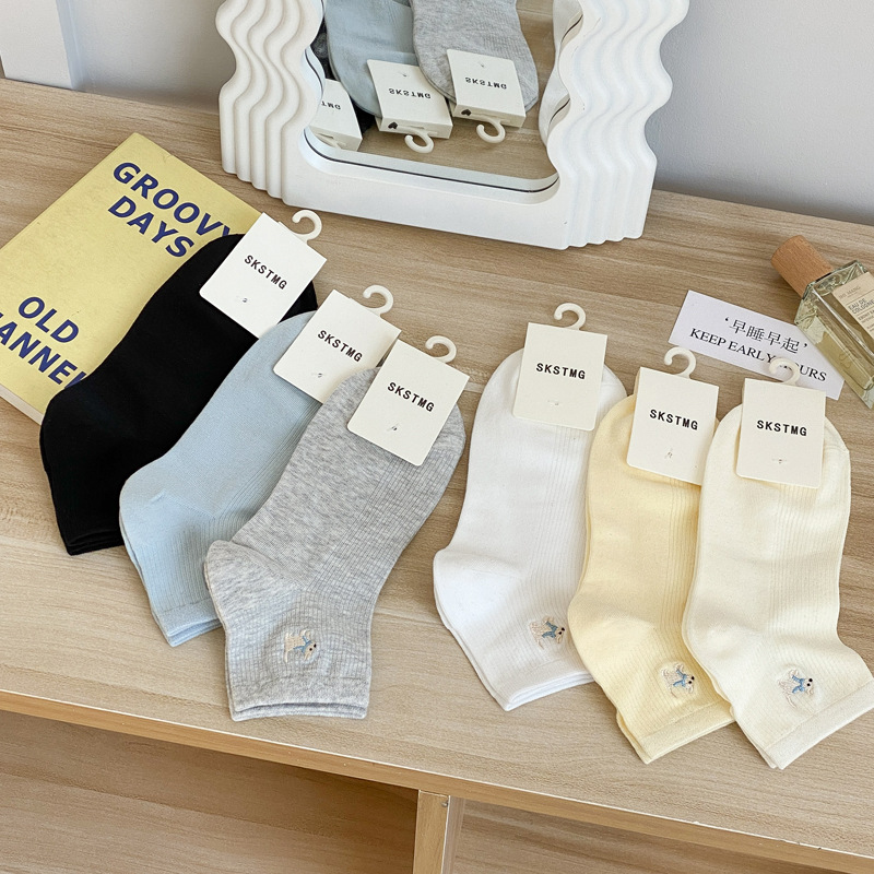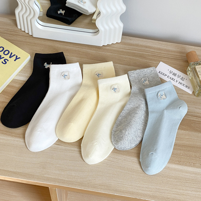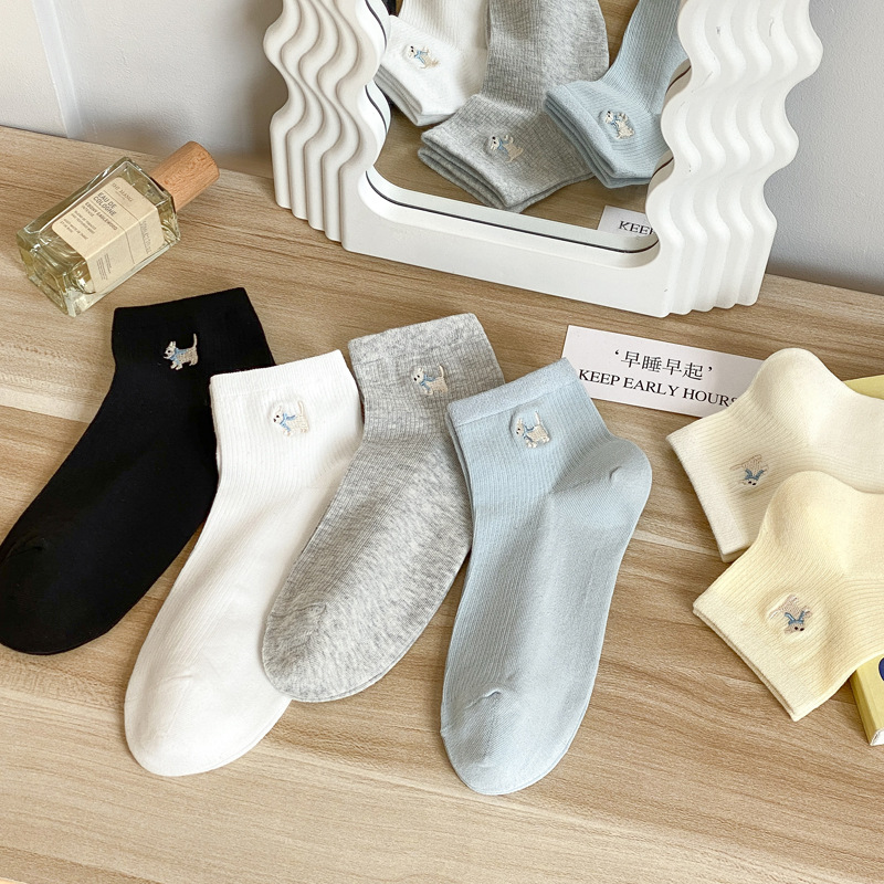 양말 여성 봄과 여름 솔리드 컬러 자수 강아지 양말 귀여운 코튼 통기성 땀 흡수 짧은 튜브 올 매치 대학 스타일 여성 양말
