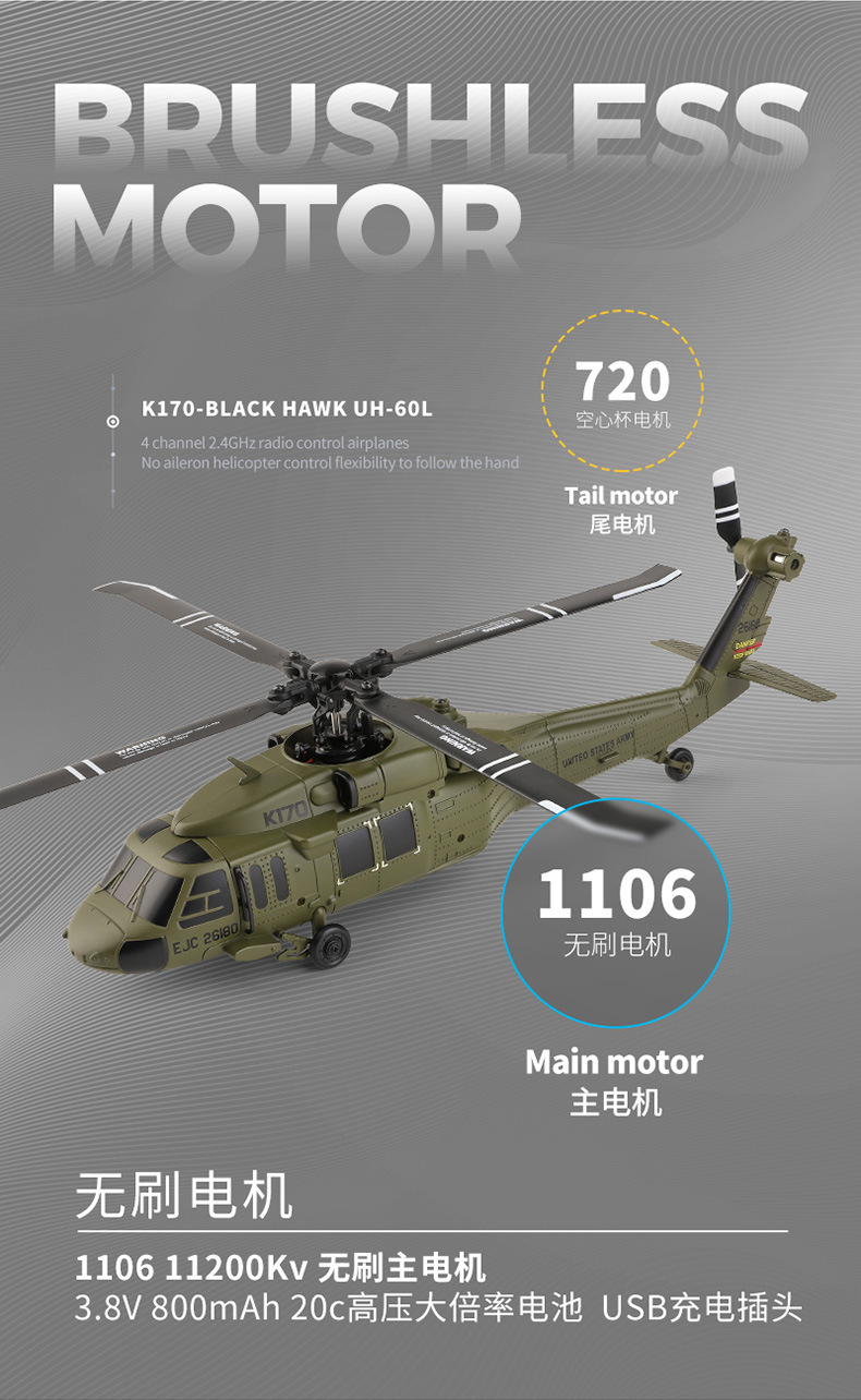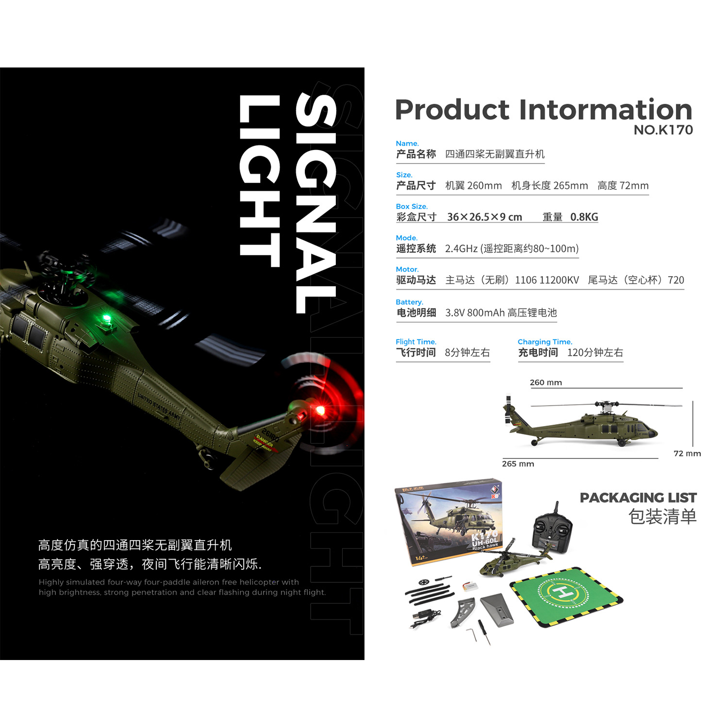 Weili K170 블랙 호크 원격 제어 헬리콥터 시뮬레이션 모델 RC 4방향 브러시리스 고정 높이 항공기 모델 UH-60L 남성용스토어 가기