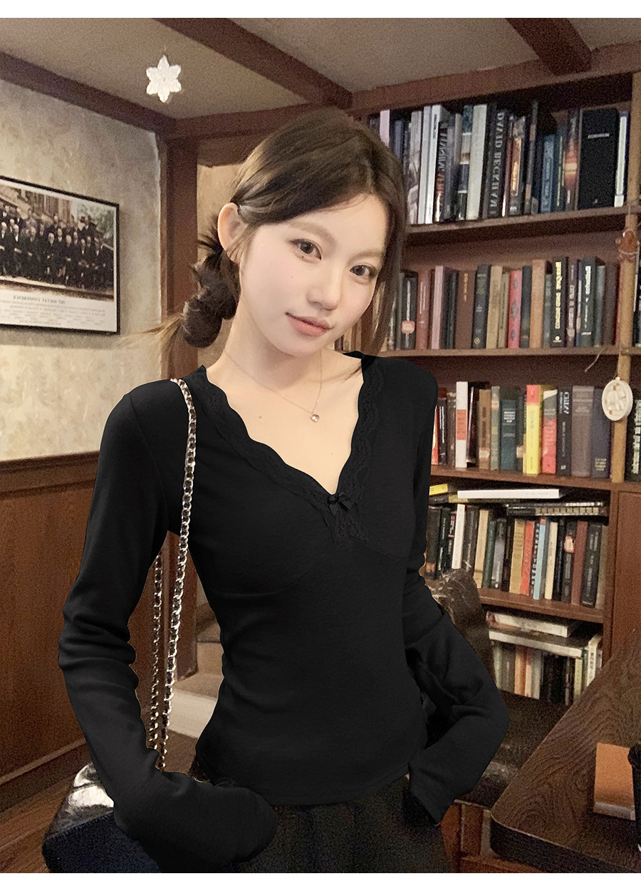 순수한 욕망 V 넥 레이스 긴팔 티셔츠 여성용 이른 봄 활 내베이스 셔츠 슬림 핏 쇼트 탑
