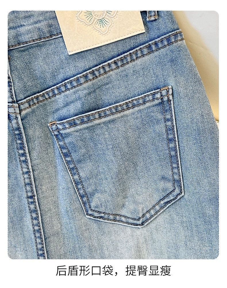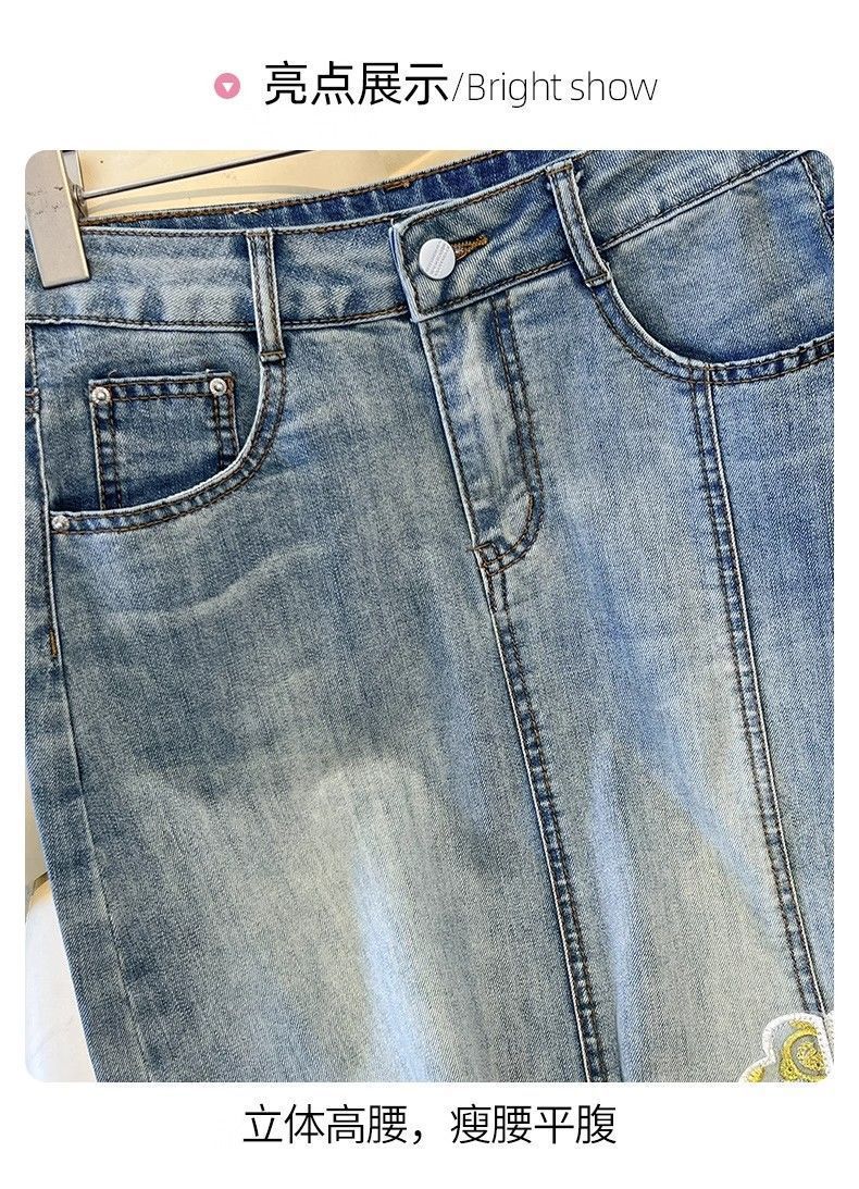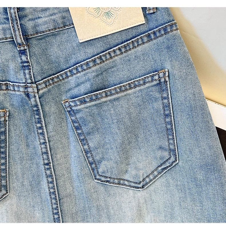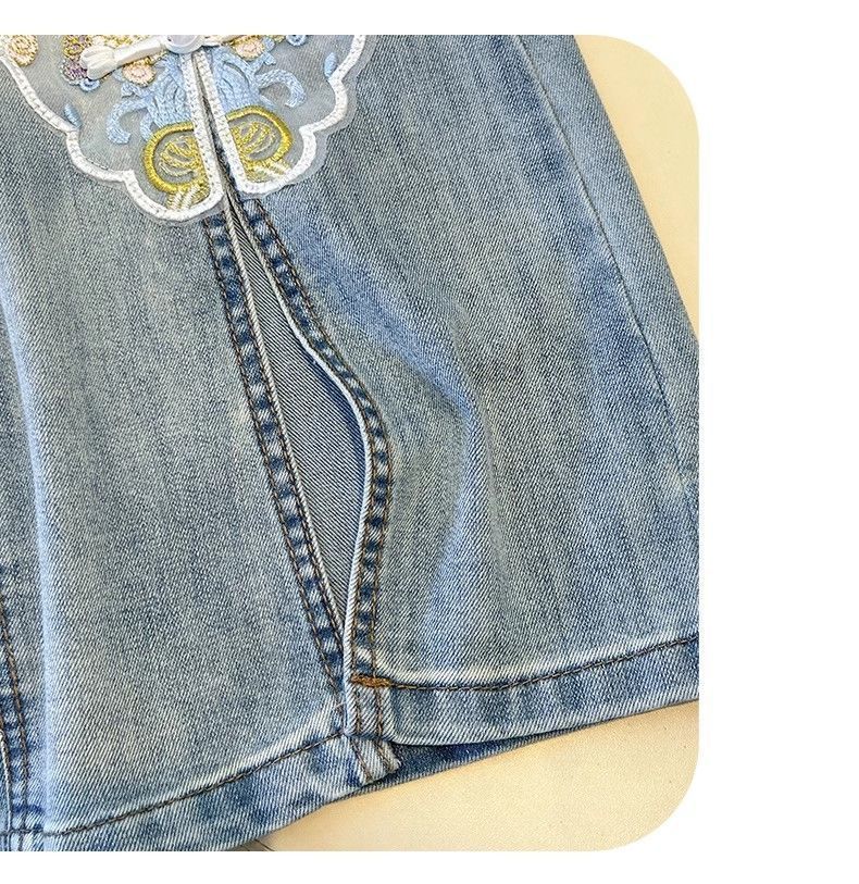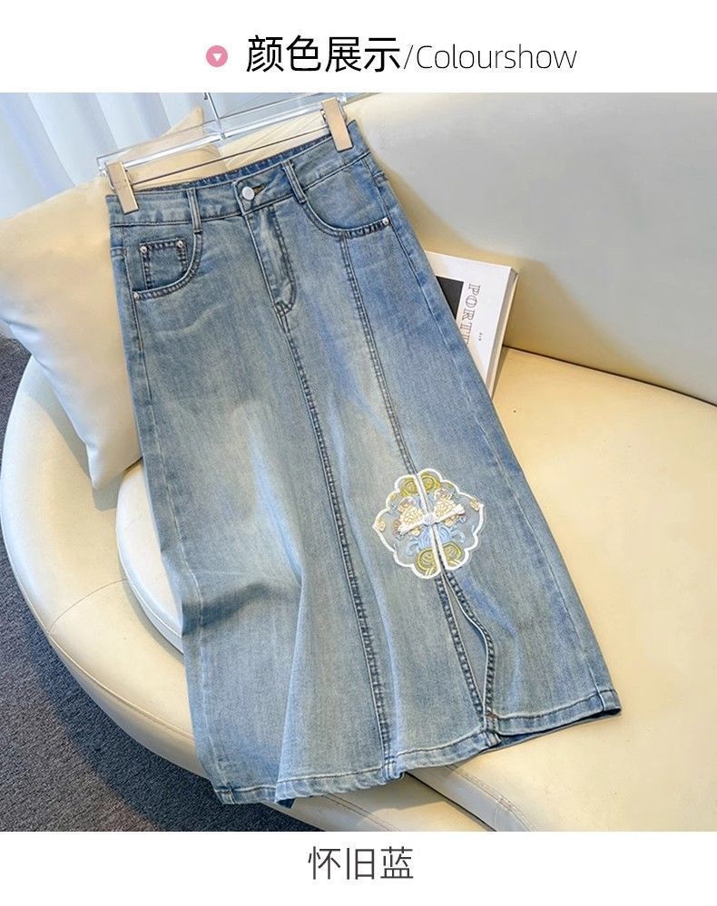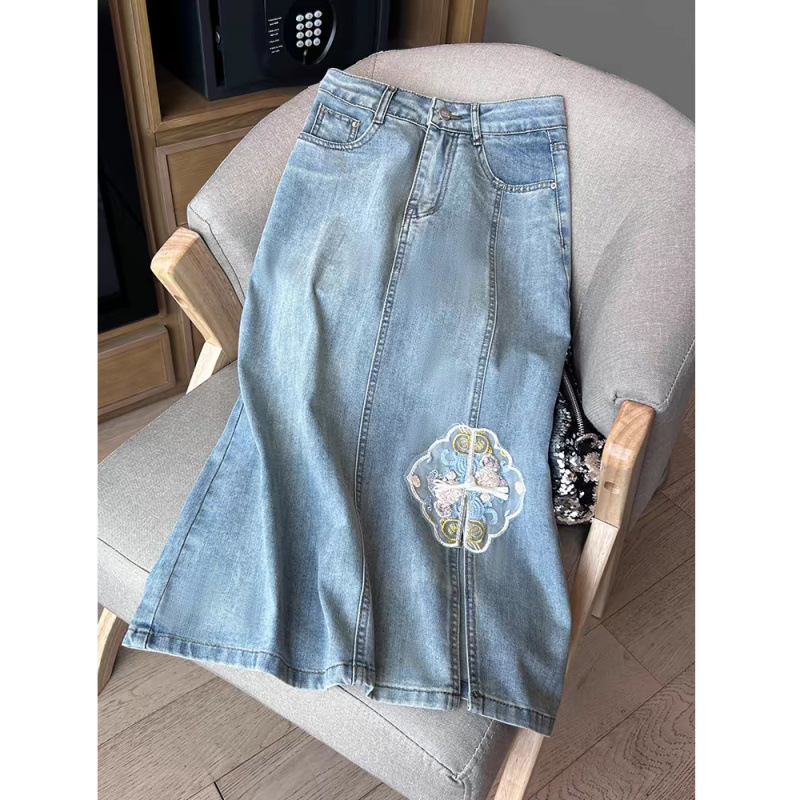 2025 년 여름 새로운 새로운 중국 자수 버클 데님 스커트 여성 높은 허리 분할 복고풍 엉덩이 A 라인 스커트