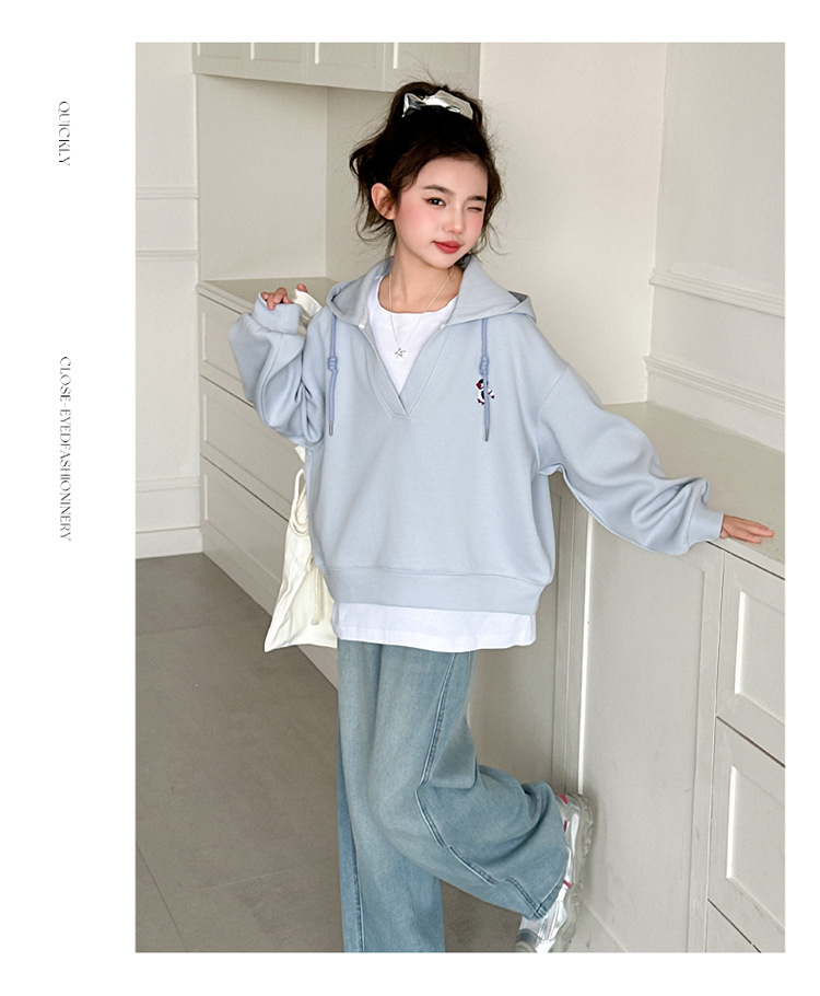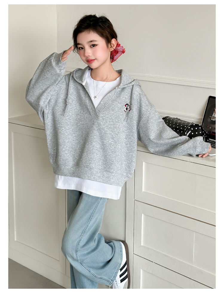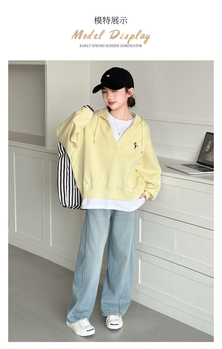소녀 세트 2025 봄 원피스 소녀의 최고 유행 청바지 큰 소년의 봄과 가을 더블 레이어 가짜 투피스 후드 스웨트 셔츠스토어 가기