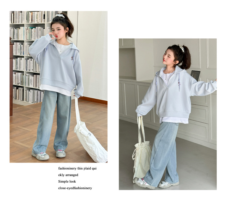 소녀 세트 2025 봄 원피스 소녀의 최고 유행 청바지 큰 소년의 봄과 가을 더블 레이어 가짜 투피스 후드 스웨트 셔츠