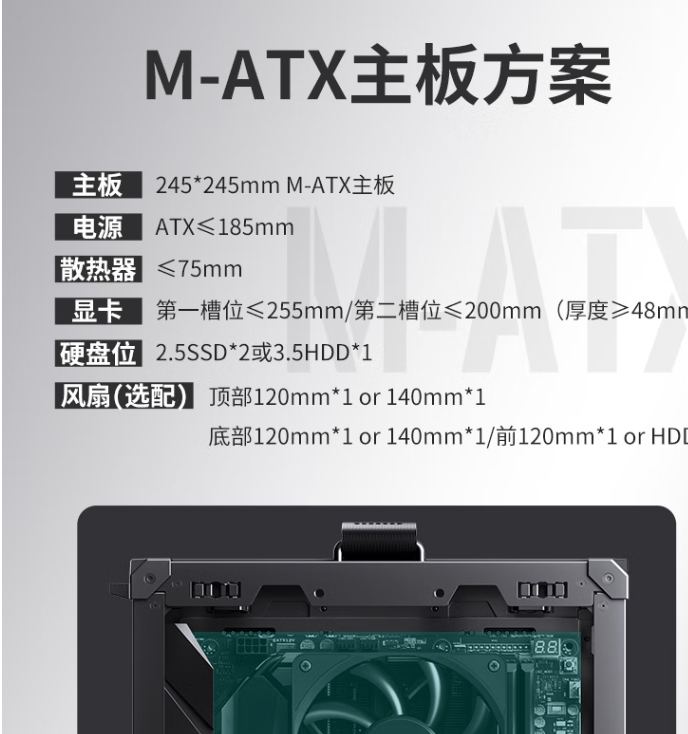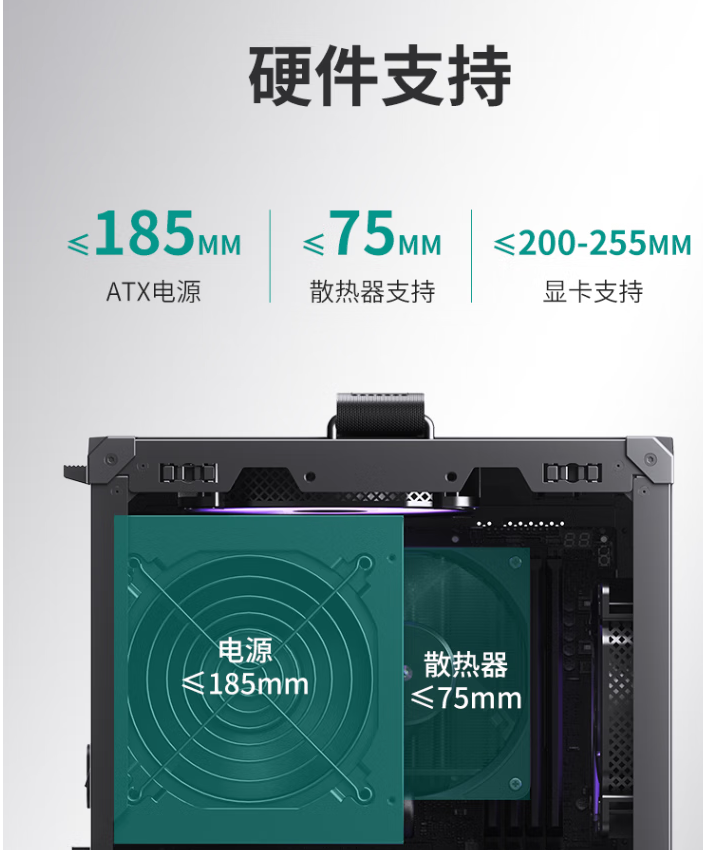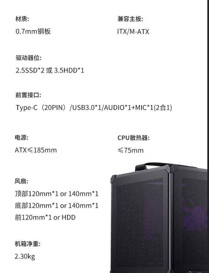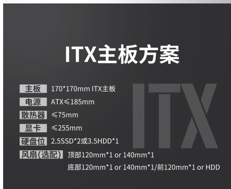 机箱配置限制:风冷限高75MM 内 只能下压式的 电源的长度185MM 内 显卡的长度最多255MM MATX 和ITX 主板