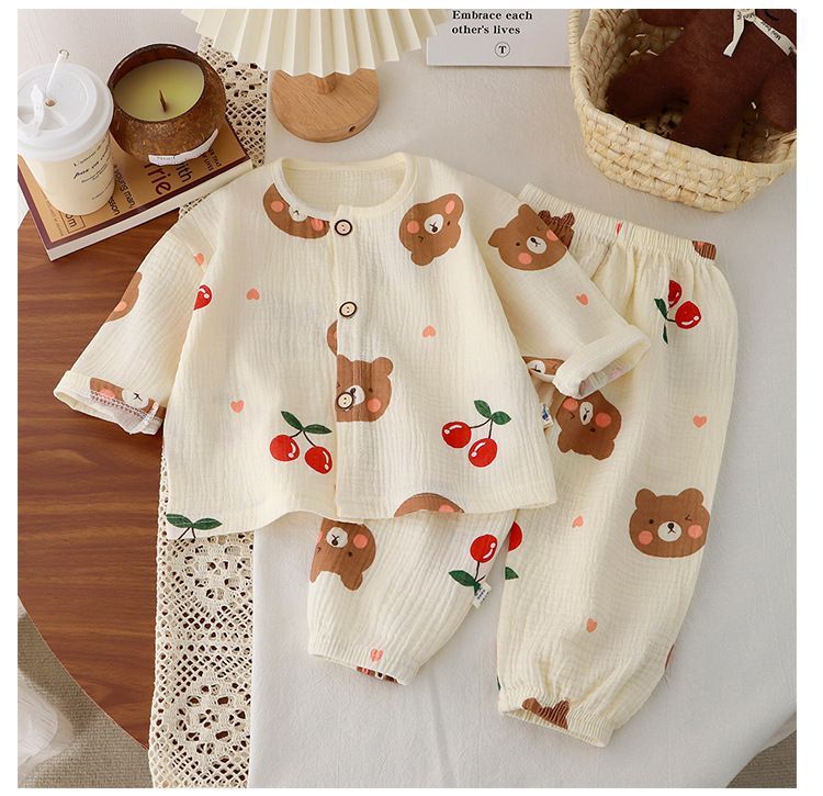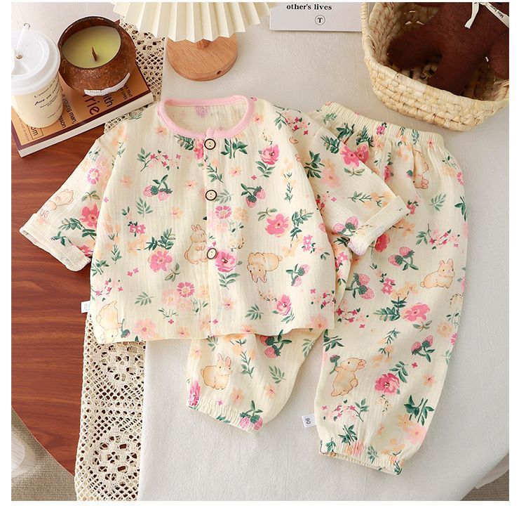 어린이 면사 새 잠옷 소녀 여름 얇은 더블 거즈 홈 옷 순면 아기 에어컨 세트