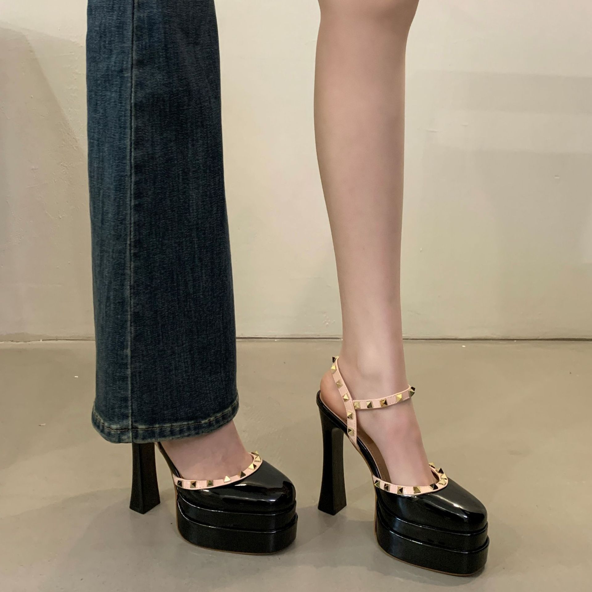 2024 Baotou 여성용 샌들 리벳 장식 여름 두꺼운 밑창 방수 플랫폼 두꺼운 슈퍼 하이힐 한 단어 버클 스퀘어 헤드스토어 가기