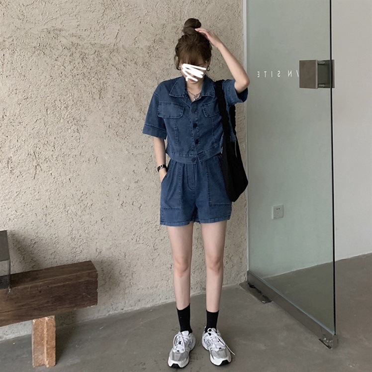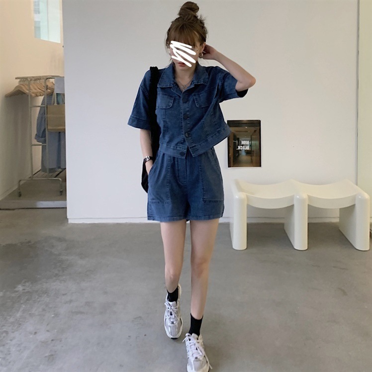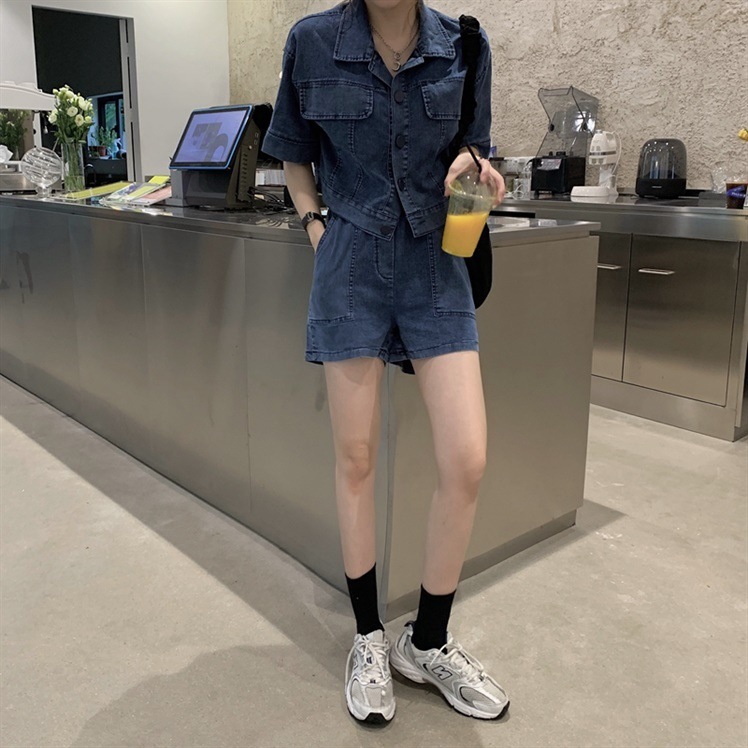 데님 세트 여자 2024 년 여름 홍콩 스타일의 반팔 재킷 느슨한 높은 허리 슬리밍 반바지 유행 투피스 세트스토어 가기
