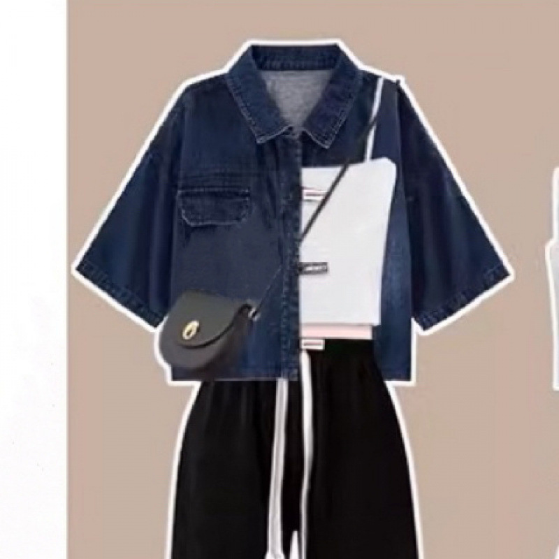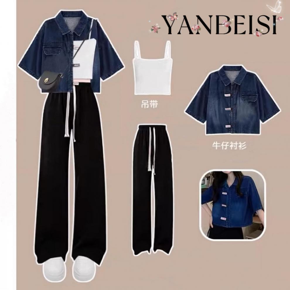 패션 세트 여성 2025 여름 한국식 짧은 데님 셔츠 화이트 조끼 블랙 와이드 레그 바지 3 피스 세트 트렌디스토어 가기