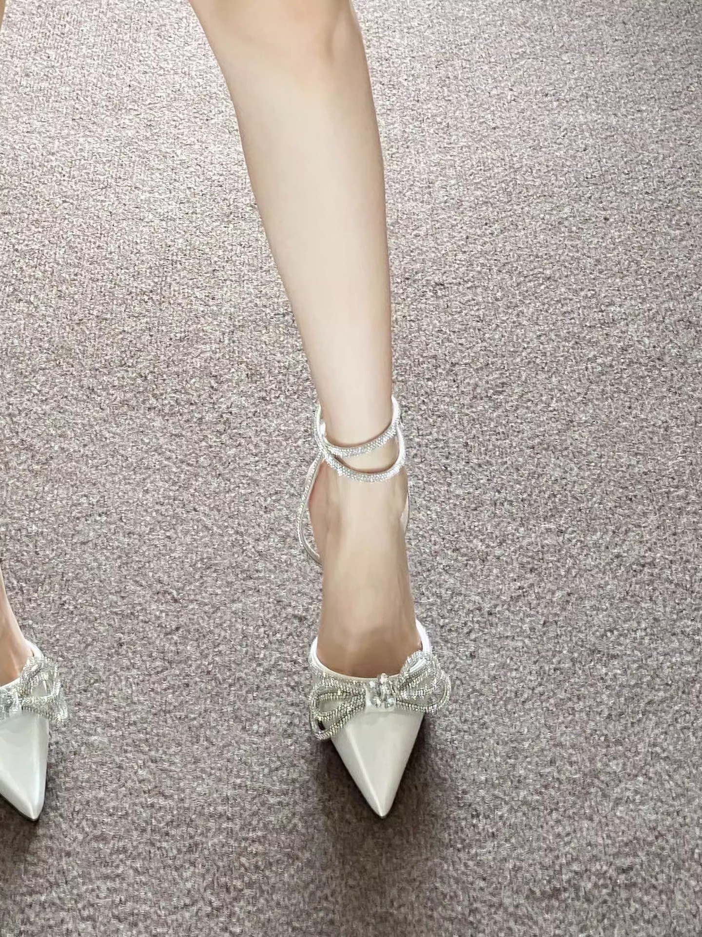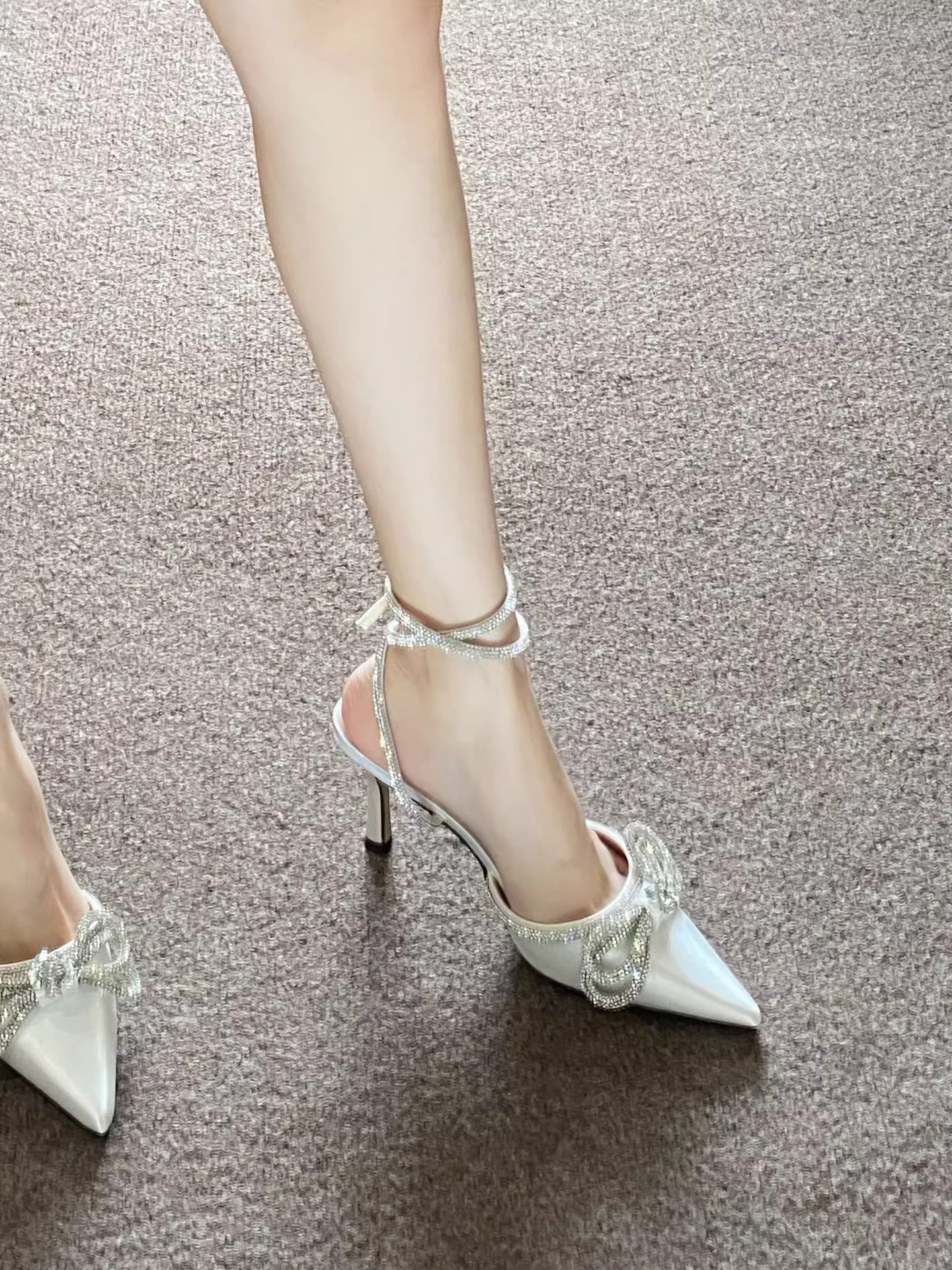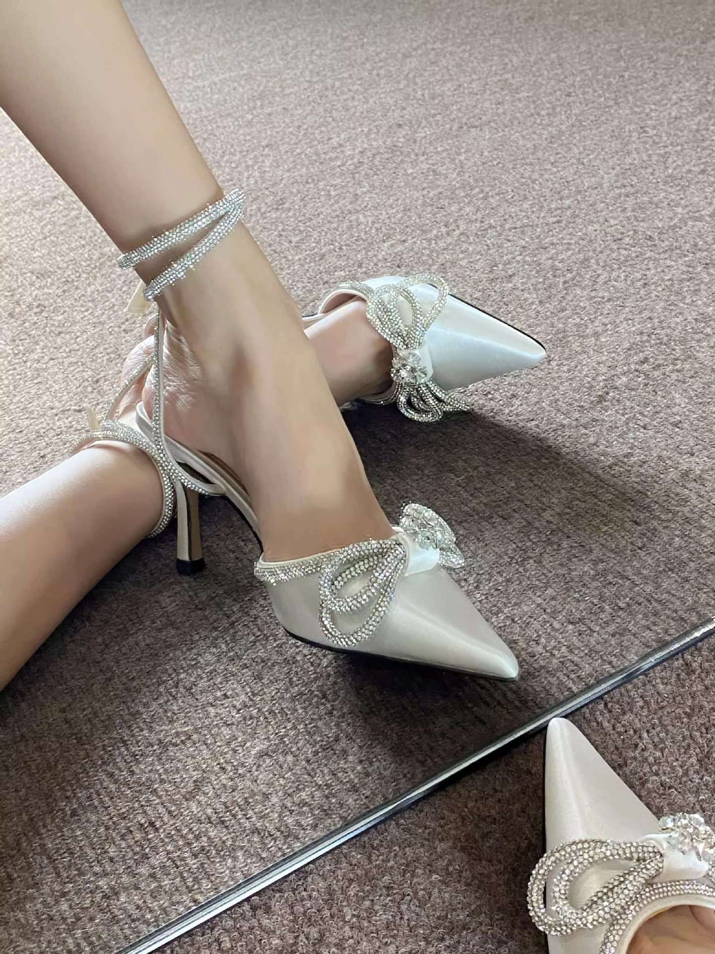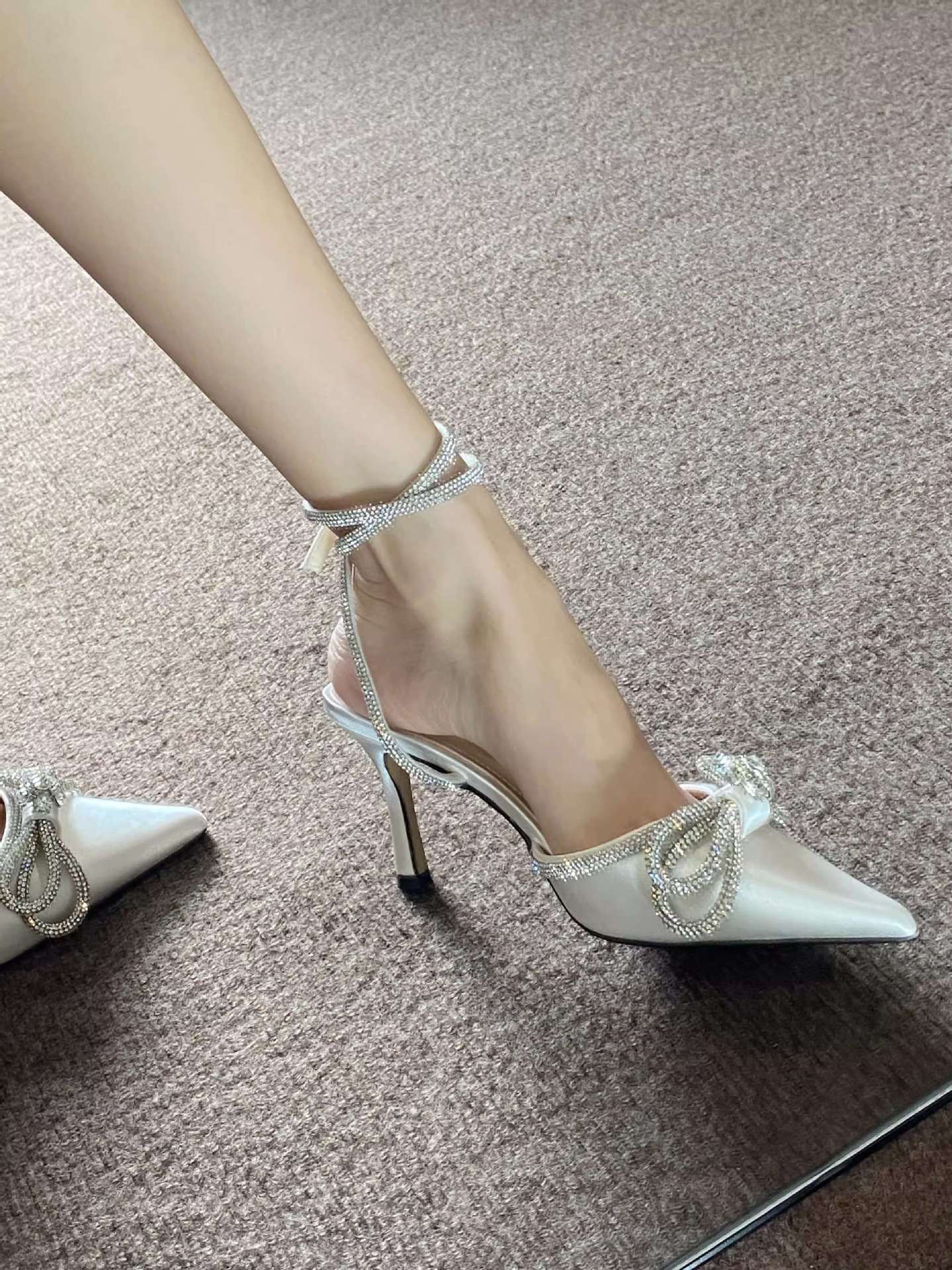 뾰족한 하이힐 여성 2025 년 봄과 가을 화이트 활 라인스톤 크로스 버클 얇은 힐 프렌치 발가락 샌들스토어 가기