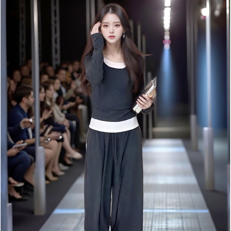 패션 스포츠 레저 세트 봄 새로운 게으른 스타일 가짜 투피스 긴팔 탑 와이드 레그 바지 투피스 세트 트렌디스토어 가기