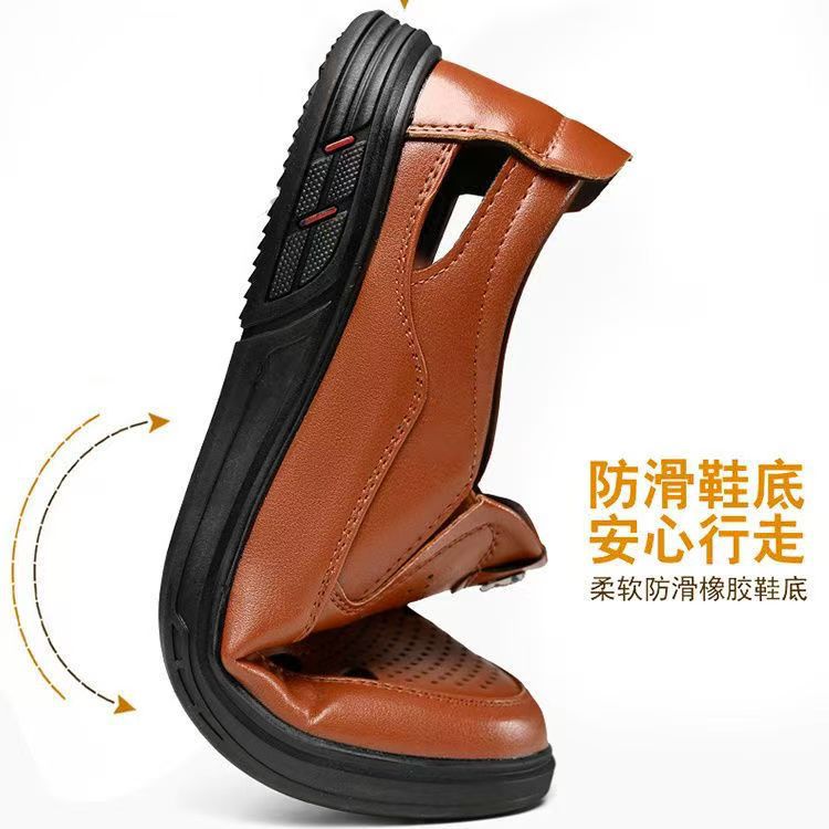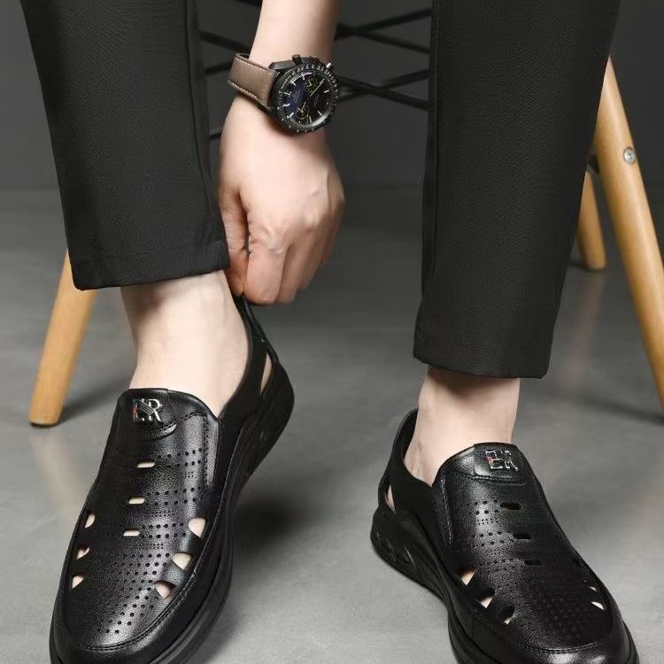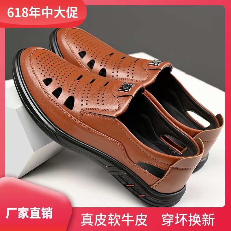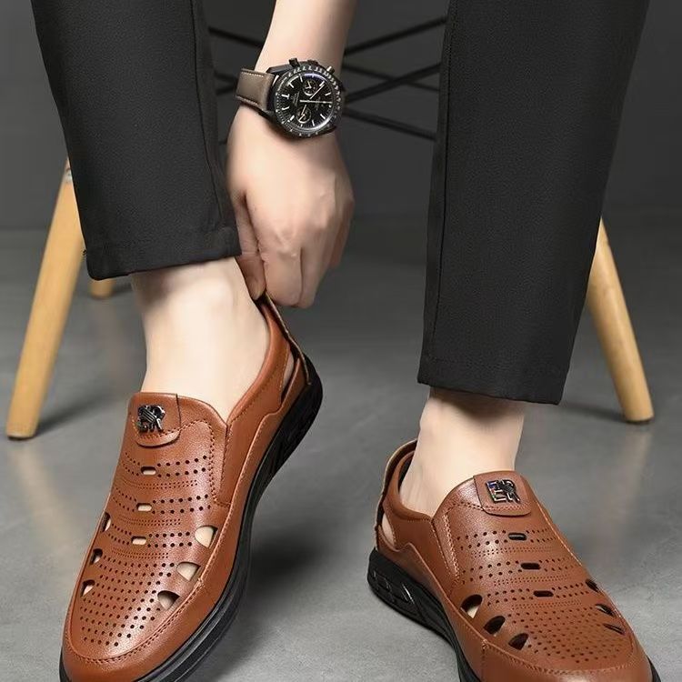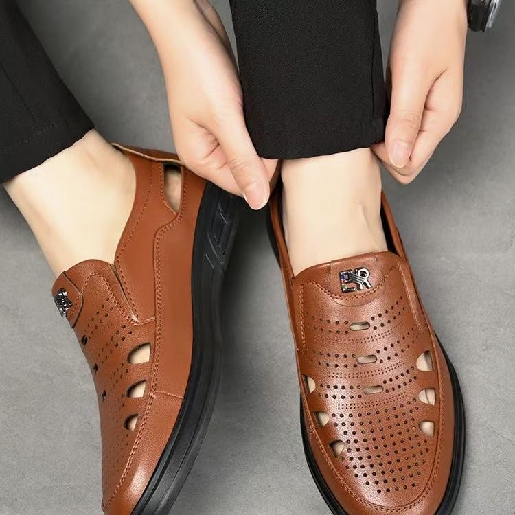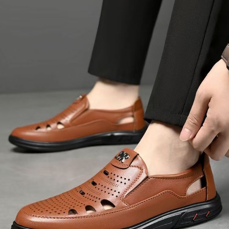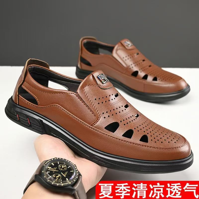 가죽 신발 남성 여름 캐주얼 가죽 중공 통기성 남성 신발 샌들 구멍 부드러운 바닥 아빠
