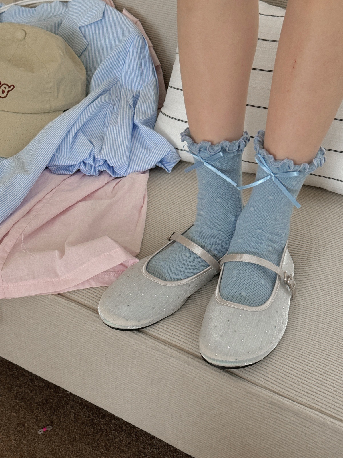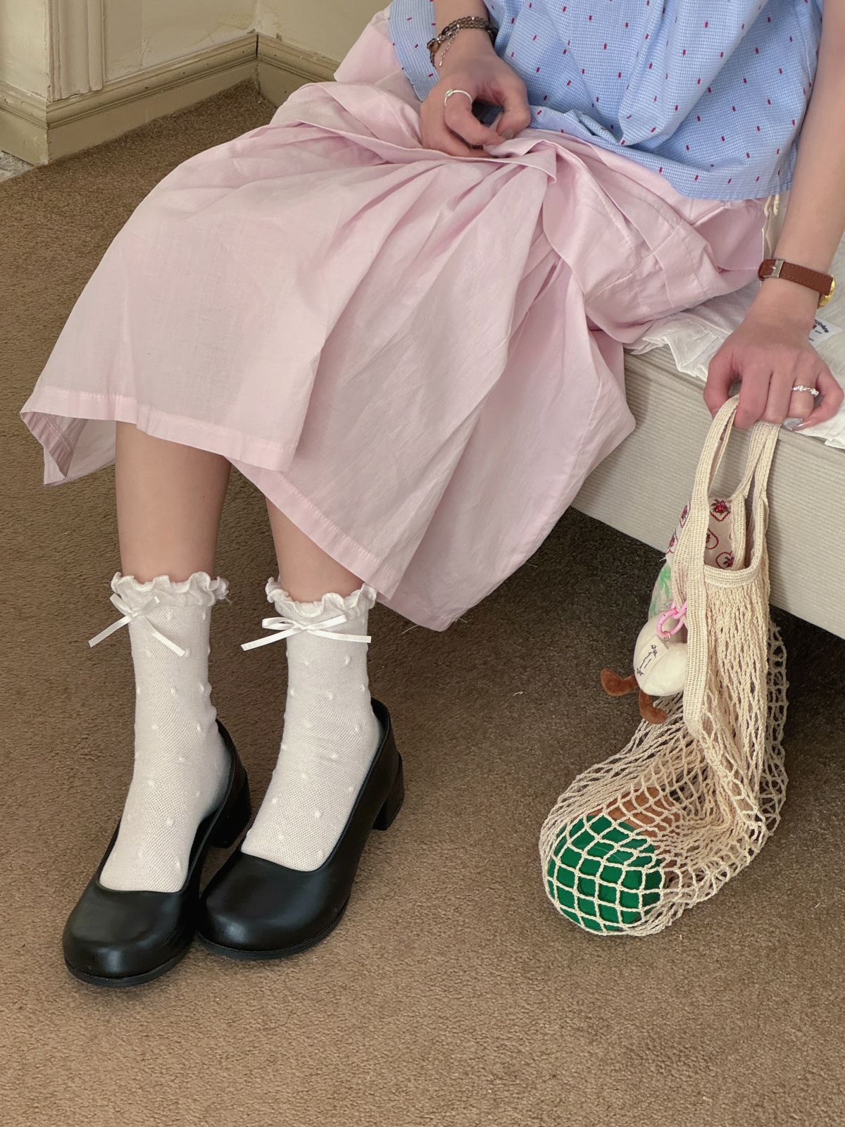 IOULOR 새로운 귀여운 우드 이어 미드 튜브 양말 봄과 여름 활 웨이브 도트 코튼 양말 땀 여성용 통기성 뼈없는 양말 흡수스토어 가기