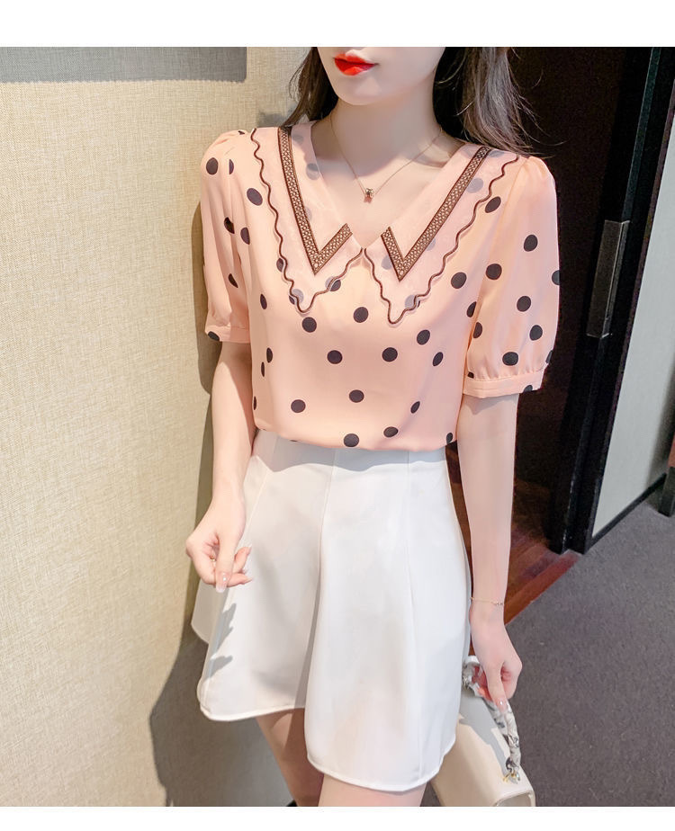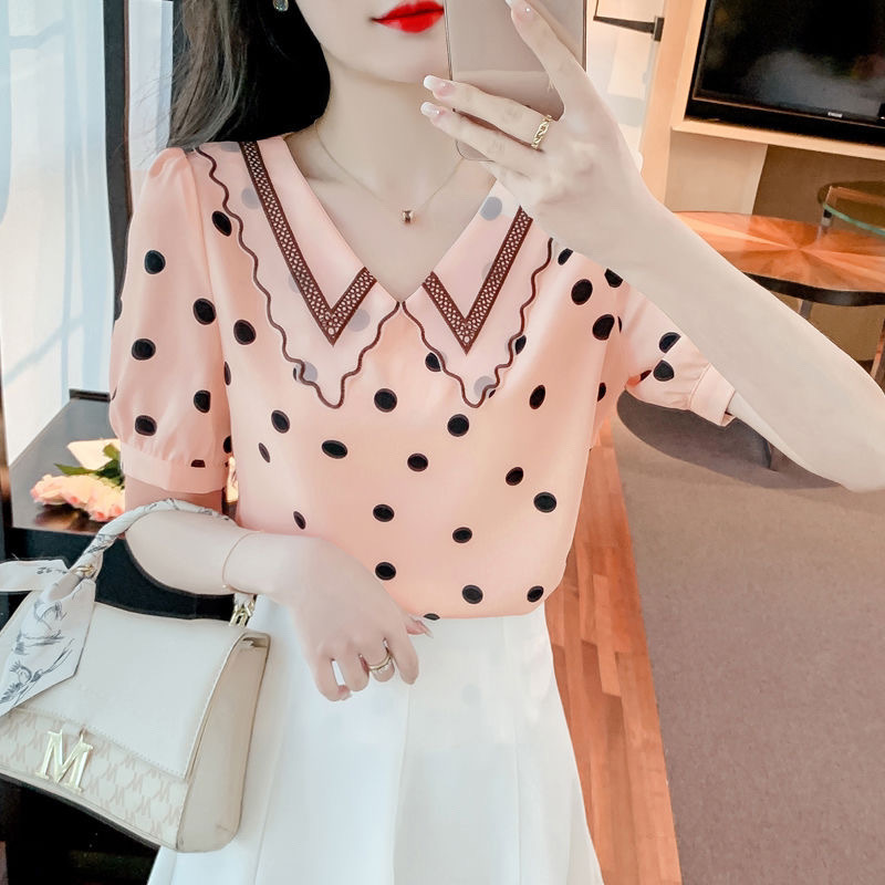 2025 새로운 여름 패션 간단한 반팔 쉬폰 셔츠 여성용 폴로 도트 하이 엔드 세련된 서양식 트렌디 셔츠스토어 가기